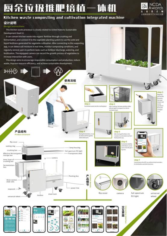 《Kitchen waste composting and cultivation integrated machine》是一款集厨余垃圾堆肥培植于一体的处理器,与联合国可持续发展目标12紧密相关。它通过粉碎和发酵,能将厨余垃圾转换为有机肥料,并连接蔬菜种植系统,将其产生的固体、液体肥料用于蔬菜种植。同时配套app,可以实时检测土壤湿度、监测堆肥情况,定时提醒用户进行排肥、浇水、施肥等工作,配备的摄像头可记录蔬菜的成长过程以增加与用户的互动。这一设计旨在鼓励负责消费和生产,减少浪费,提高资源效率,实现可持续发展。