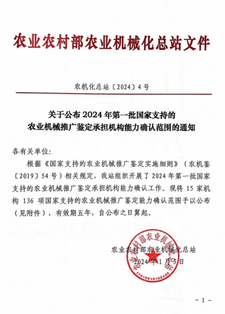 近日,农业农村部农业机械化总站关于发布了《2024年第一批国家支持的农业机械推广鉴定承担机构能力确认范围的通知》(农机化总站〔2024〕4号)文件,我省农机鉴定站获批国家支持的农业机械推广鉴定能力两类(犁、喂料机),新增了铧式犁、圆盘犁、翻转犁、喂料机和送料机共5项资质。