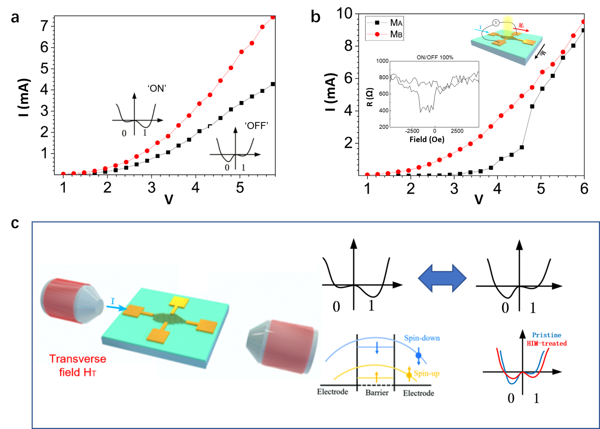 二维半导体,包括过渡金属二掺杂物(TMDs),在电子学和光子学领域备受关注,但其固有形式仍然是非磁性的。该文用氦离子束辐照处理机械剥离的MoS2,使它在室温下表现出半导体和铁磁性,通过蒙特卡罗模拟和理论计算证实纳米孔的控制导致了磁性的存在。此外,多层MoS2的辐照结果表明,磁矩随着层数的增加而增大。氦离子束处理前后,导电性几乎保持不变。经过处理的MoS2自旋电子器件在光、磁场和/或电场的作用下显示出"开/关"开关,这意味着二维光敏铁磁半导体功能在室温下得到了成功展示。