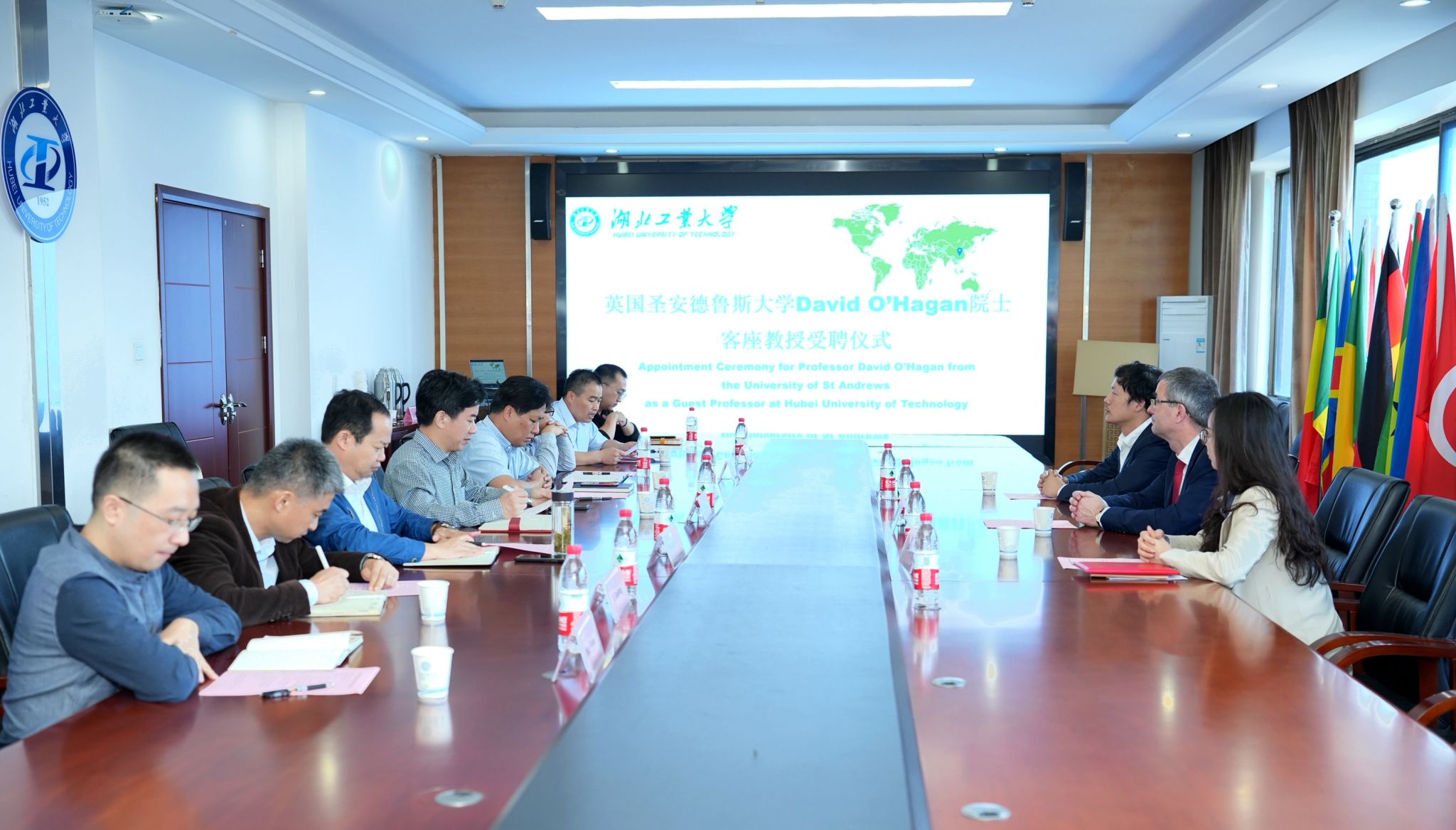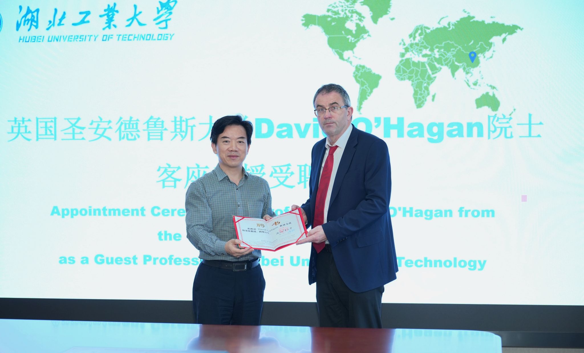 交流会举行了聘任仪式,英国圣安德鲁斯大学David O’Hagan院士受聘为我校客座教授,宋小春校长为David O’Hagan院士颁发聘任证书。David O’Hagan教授感谢校方的邀请,对受聘为湖北工业大学深感荣幸。他介绍了英国圣安德鲁斯大学的历史及其相关中英国际合作项目情况,提出深入合作倡议,积极发挥外方主任和客座教授的职责,推动两校在学生培养、国际学术交流合作和平台建设等方面工作,这也是此次来华之行的目的和成果。