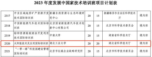 近日,科技部国际合作司印发了《2023年度发展中国家技术培训班项目计划表》,在学校国际合作交流处与科发院大力支持下,湖北工业大学职业技术师范学院马丹教授团队申报的2023年度发展中国家技术培训班项目“太阳能技术及应用国际培训班”成功获批立项。