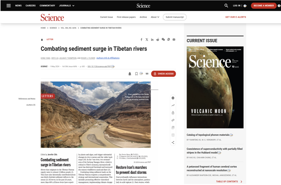 5月10日,《Science》上发表以湖北工业大学为第一署名单位的Letter文章“Combating sediment surge in Tibetan rivers”,探讨青藏高原河流泥沙增加原因及其对生态环境的影响,并提出了应对策略(论文链接https://www.science.org/doi/10.1126/science.ado7997)。这也是学校首次在《Science》发表文章。