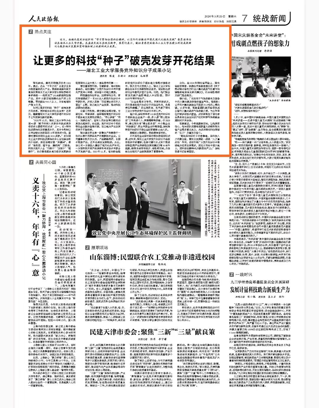 5月25日《人民政协报》第7版以“让更多的科技‘种子’破壳发芽开花结果”为题,专题报道了我校党外知识分子服务地方发展成果。这是继新华网、光明日报之后,近3个月以来,央媒对我校发挥党外知识分子作用服务地方发展成果的再次专题报道。