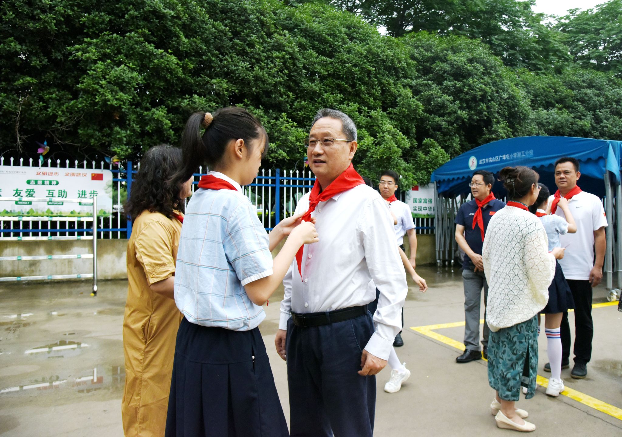 在广埠屯小学湖工分校,学校正举行“六一游戏乐 童年趣满园”庆祝活动,少先队员们给彭育园一行系上了鲜艳的红领巾。彭育园走进活动现场,受到孩子们的热情欢迎,彭育园为同学们送上节日的祝福和礼物,勉励大家要牢记习近平总书记谆谆教导,从小坚定听党话、跟党走的决心,树立远大理想,勤奋学习知识,锻炼强健体魄,努力做到德智体美劳全面发展,争做国家的有用之才、栋梁之才。