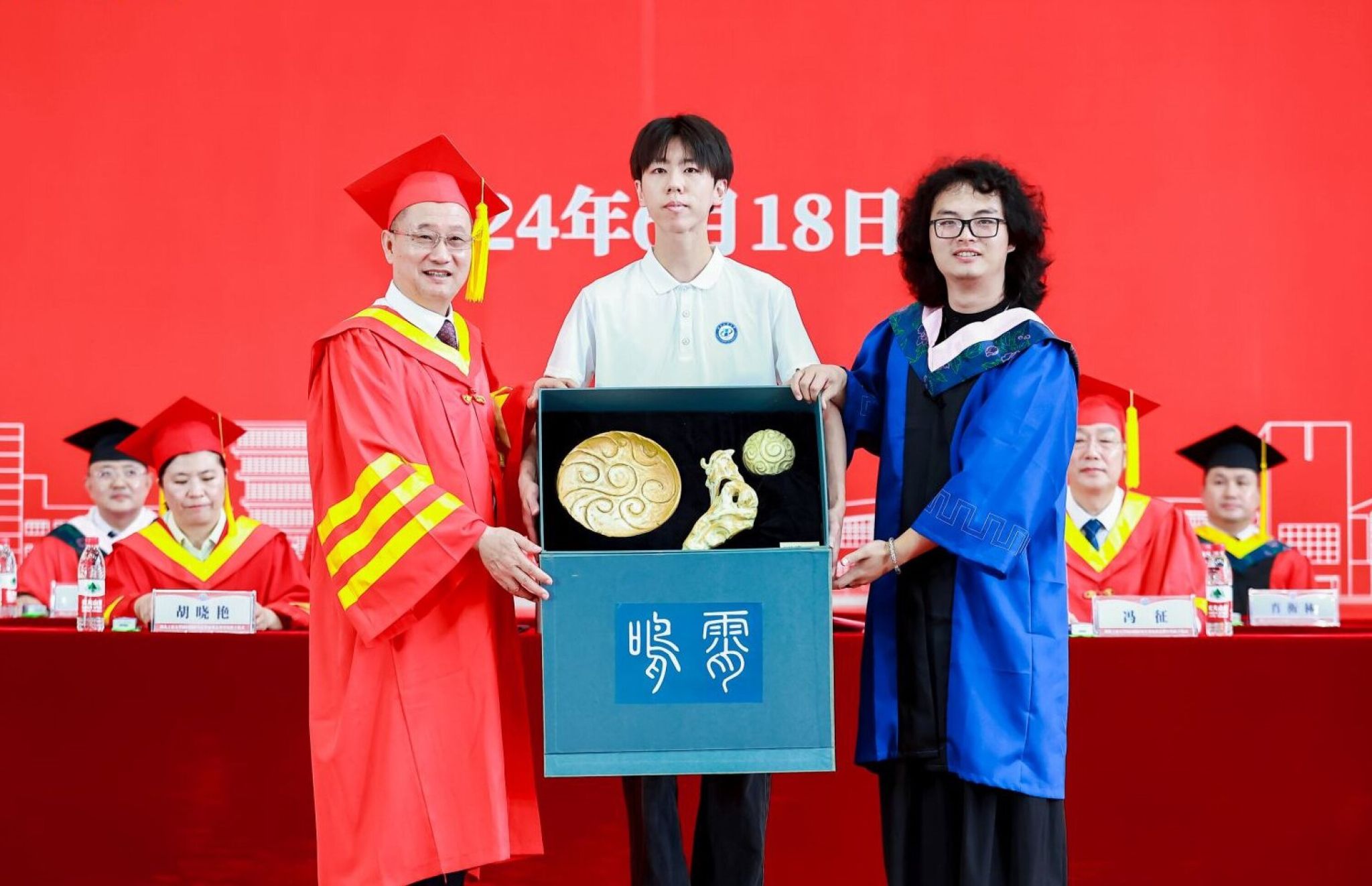 艺术设计学院研究生冯正午同学作为毕业生代表,为母校赠送自己亲手设计制作,以凤纹为设计元素的套系艺术品《鸣霄》。瓷盘寓意着母校广纳贤才,汇聚精彩;镇纸寓意着母校稳步前进,祥和熙秀;凤鸟向天而鸣,祝愿母校继往开来,砥砺奋进,再创辉煌。