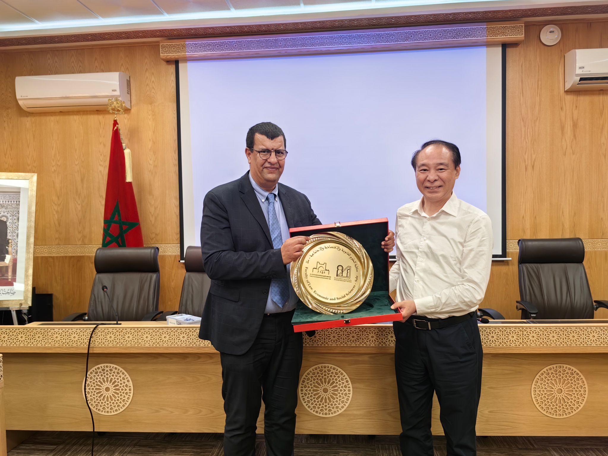 7月5日,代表团拜访摩洛哥默罕默德五世大学,学校副校长兼法学院院长奥马尔和法学院副院长参加了本次交流,在座谈会上王侃介绍了我校与摩洛哥交流合作以及我校摩洛哥籍学生培养的相关情况,双方进行了深入交流并互赠纪念品。