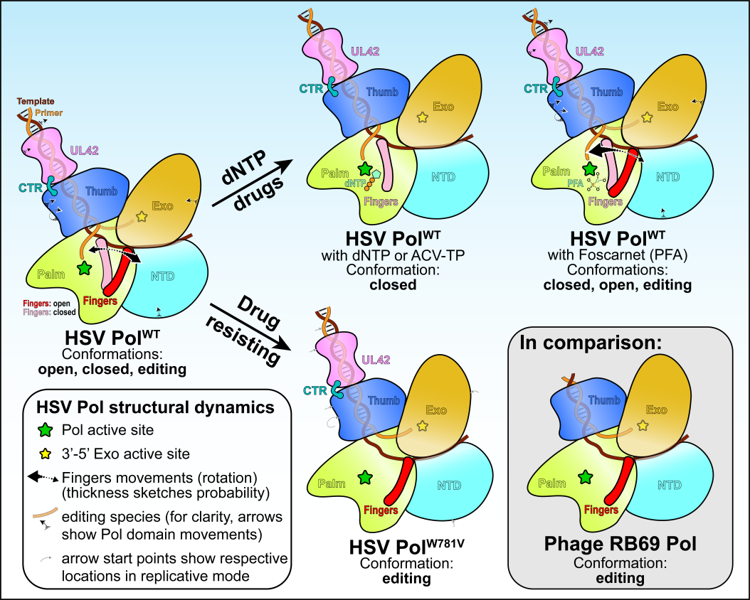 本研究报道了在引入或缺失核苷酸的情况下疱疹病毒Pol-UL42异源二聚体结合DNA引物-模板的高分辨率结构。这些结构的解析有助于阐明该病毒聚合酶持续进行DNA合成的机制,并可作为模板帮助设计捕获Pol不同构象状态的变构抑制剂,从而对抗抗病毒药物产生的新的耐药性。