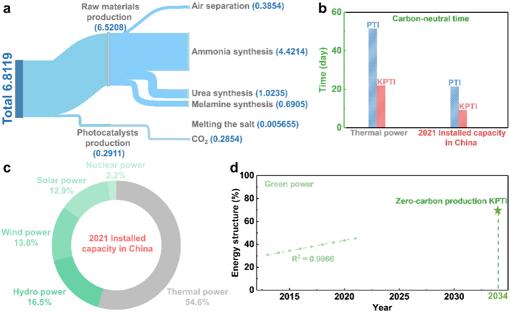 生命周期评价结果表明KPTI光催化剂只需在阳光照射下运行22.0天就可以实现光催化全生命周期的碳中和,并且随着中国绿色电力比重的提高,到2034年可实现零碳生产KPTI光催化剂。