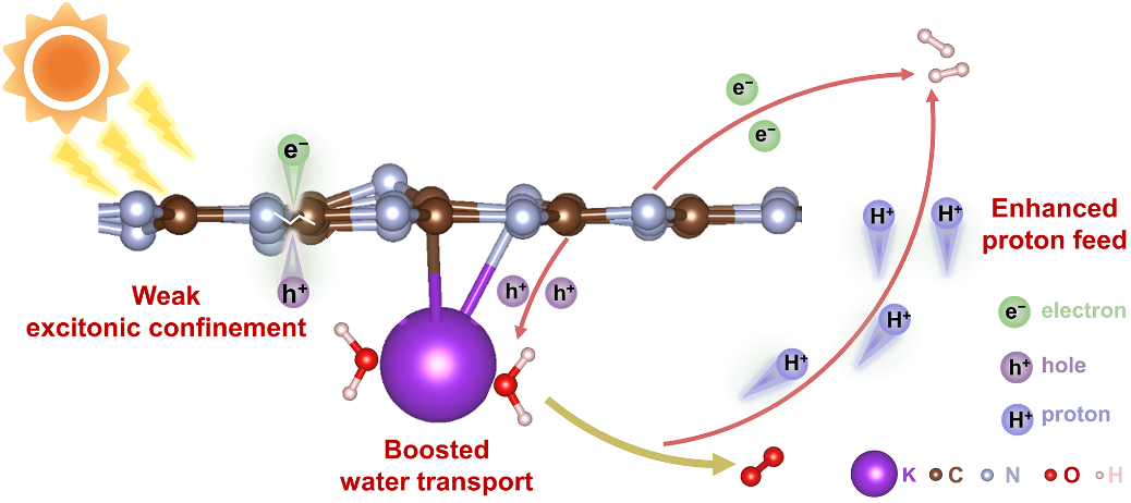 本文设计了一种熔盐策略来合成掺钾聚三嗪酰亚胺(KPTI)光催化剂,实现了高效全水分解。钾-碳-氮构型的形成不仅降低了KPTI的激子结合能,提高了光生电子与空穴的分离效率,而且通过形成界面K•H2O团簇促进了水的解离,为析氢反应提供足够的质子。此外,KPTI通过降低*OOH的形成能垒,促进O2析出和抑制惰性C=O键形成,进而增强了氧化位点的稳定性。