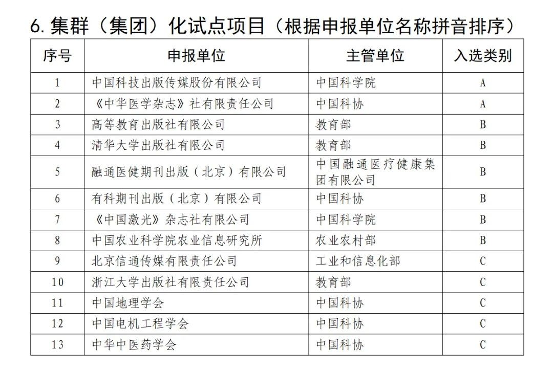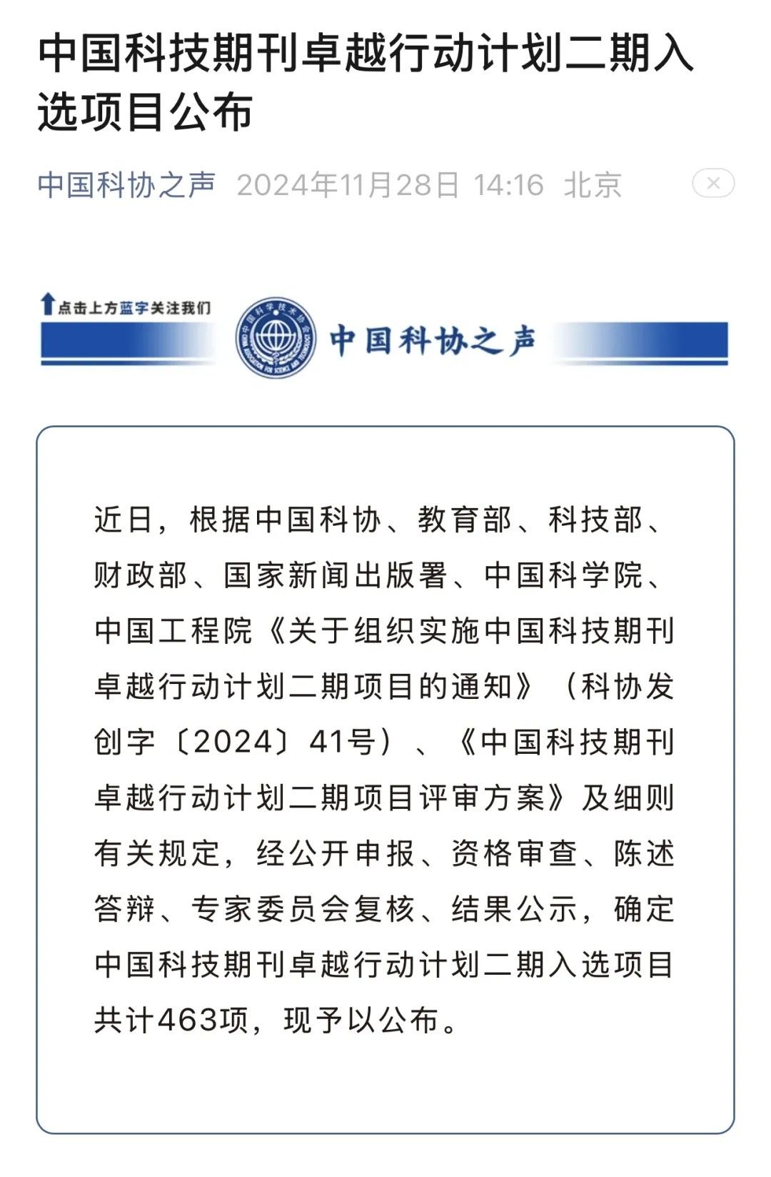 近日,根据中国科协、教育部、科技部、财政部、国家新闻出版署、中国科学院、中国工程院《关于组织实施中国科技期刊卓越行动计划二期项目的通知》(科协发创字〔2024〕41号)、《中国科技期刊卓越行动计划二期项目评审方案》及细则有关规定,经公开申报、资格审查、陈述答辩、专家委员会复核、结果公示,确定中国科技期刊卓越行动计划二期入选项目共计463项。入选名单已于2024年11月28日公布。