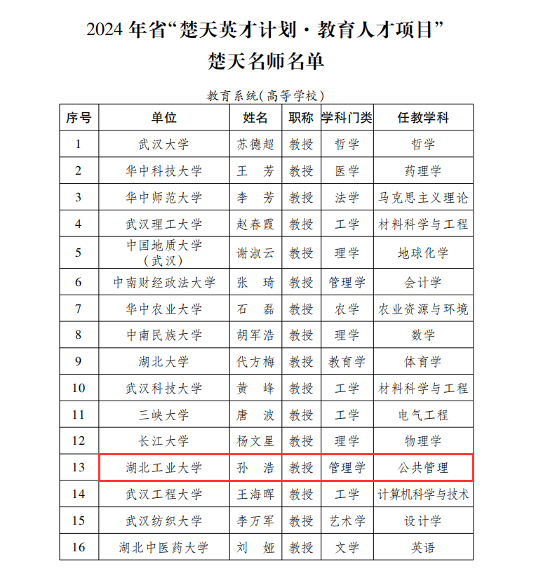近日,中共湖北省委人才工作领导小组办公室、湖北省教育厅印发2024年省“楚天英才计划·教育人才项目”楚天名师名单,我校经济与管理学院孙浩教授获得“楚天英才计划·教育人才项目”楚天名师(以下简称“楚天名师”)荣誉称号。