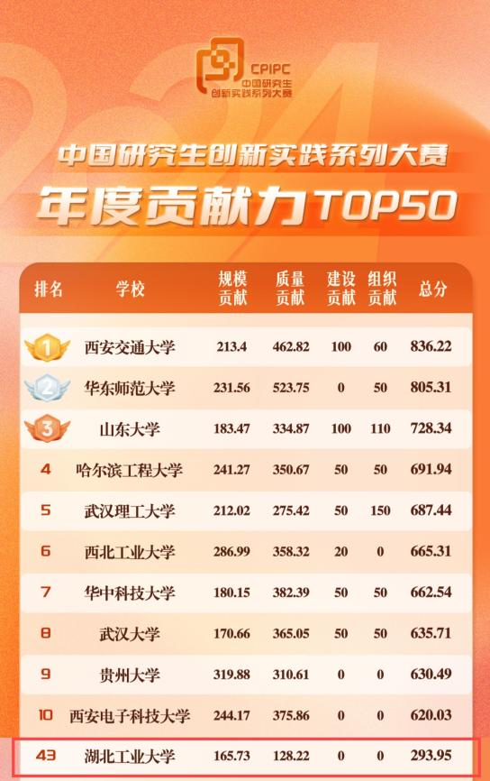 研究生培养单位大赛贡献力主要包括规模贡献、质量贡献、建设贡献和组织贡献四项指标,旨在全方位、多角度地评估各高校在研究生创新实践工作中的综合实力与贡献程度。据悉,我校在全国研究生培养单位规模贡献力、质量贡献力、报名情况、获奖情况TOP100榜单中,均稳居湖北省高校前5名。