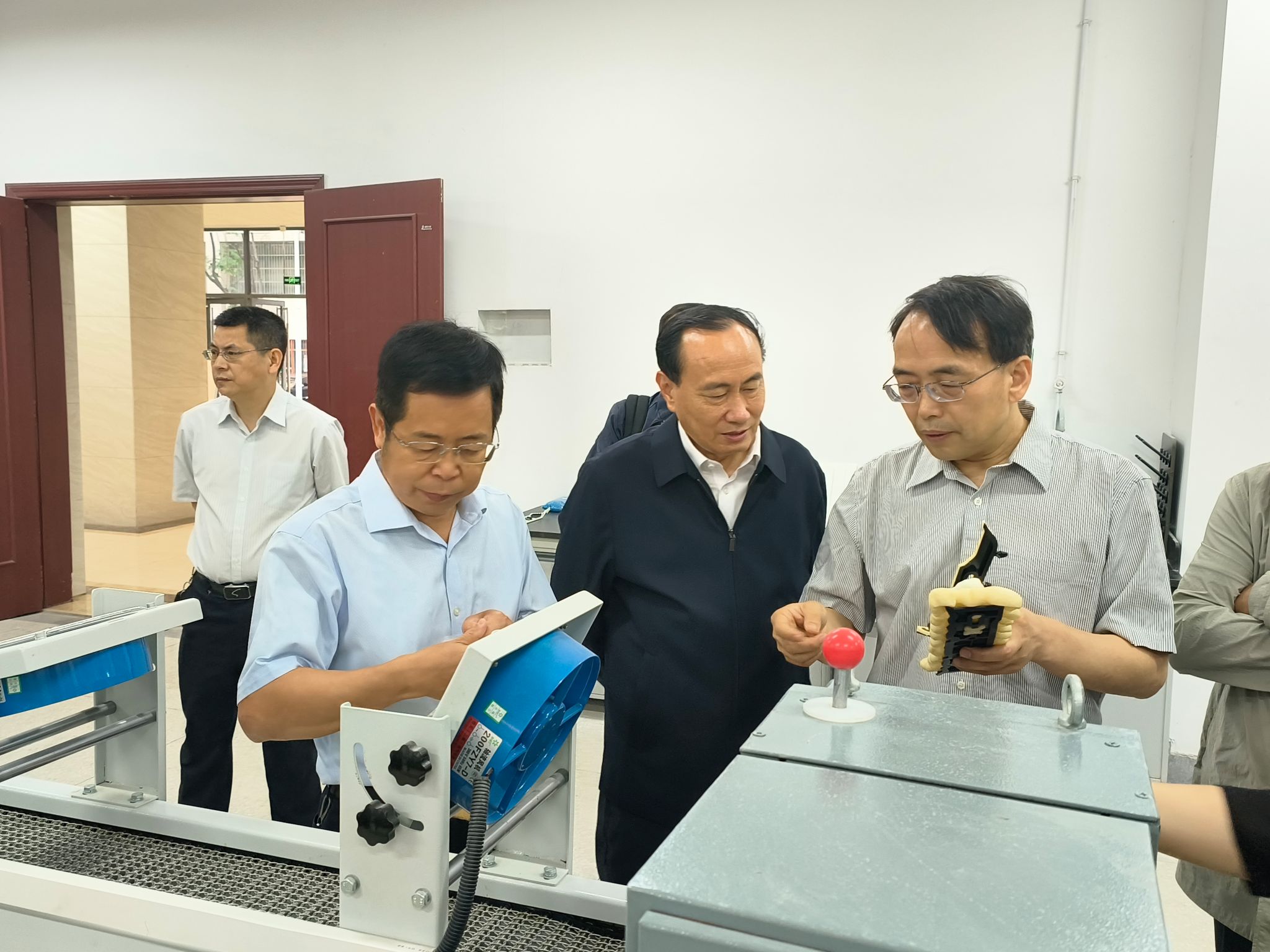 在校党委常委、副校长陈自才及科发院负责人陪同下,专家组深入绿色轻工材料湖北省重点实验室,实地考察项目研发生产线与测试平台。项目负责人、材料学科带头人胡圣飞教授现场讲解并演示了EVA(乙烯-醋酸乙烯酯共聚物)定向发泡材料的制备工艺,并重点介绍了该材料在轻量化、隔音降振、耐候性等方面的性能优势。