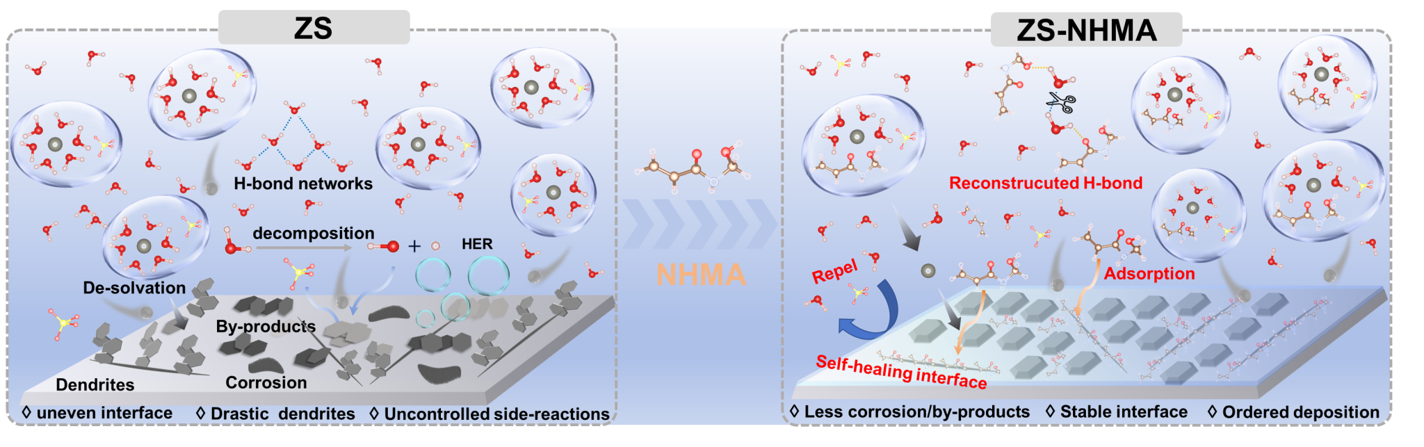 可持续能源存储技术是实现未来低碳发展的关键支撑,其中水系锌离子电池因其安全性高、成本低和理论容量大,受到广泛关注。然而,商业锌金属负极普遍存在表面划痕、褶皱与微裂纹等制造缺陷,这些缺陷容易引发电场畸变、析氢副反应和锌枝晶生长,导致电池性能衰退甚至短路失效。如何实现界面自适应调控、有效修复缺陷、并稳定离子输运通道,成为构建高性能锌离子电池的关键挑战。本研究提出一种原位自聚合策略,在电解液中引入具有羟基与酰胺基的不饱和N-羟甲基丙烯酰胺(NHMA)分子,在锌沉积过程中自发形成自修复聚合界面层,从根本上调控界面反应行为,显著提升锌负极的可逆性与循环稳定性。