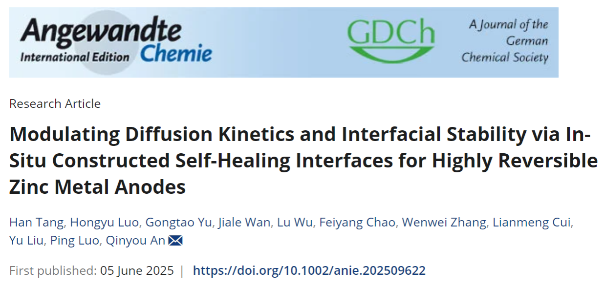 Han Tang, Hongyu Luo, Gongtao Yu, Jiale Wan, Lu Wu, Feiyang Chao, Wenwei Zhang, Lianmeng Cui, Yu Liu, Ping Luo, Qinyou An; Modulating Diffusion Kinetics and Interfacial Stability via In-Situ Constructed Self-Healing Interfaces for Highly Reversible Zinc Metal Anodes. Angew Chem Int Edit. 2025, e202509622.