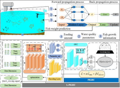 全球水产养殖正在迅速扩张,需要采取综合方法进行生态转型和绿色实践以促进可持续发展。本研究提出了一种长短期记忆物理知情门控循环单元,将鱼类生长与水质和摄食量相关联,其中长短期记忆模块将环境因素映射到物理状态,并通过分层结构捕获长程非线性耦合效应,物理知情门控循环单元使用微分代数形式将时间建模与生物物理约束相结合,从而能够精确表征非线性水产养殖动力学,研究方法部署于校内工厂化循环水养殖平台。