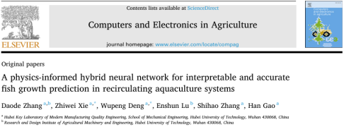 近日,农机院、机械工程学院张道德教授团队在农林科学领域国际顶刊《Computers and Electronics in Agriculture》(中科院一区Top期刊)发表题为“A physics-informed hybrid neural network for interpretable and accurate fish growth prediction in recirculating aquaculture systems”的研究论文。张道德教授为第一作者,博士研究生谢志伟与机械工程学院青年教师邓武鹏为通讯作者。我校为该论文唯一署名单位,进一步提升了我校在农林科学领域的影响力。这是我校农机院首次在农林科学领域顶刊发表学术论文。