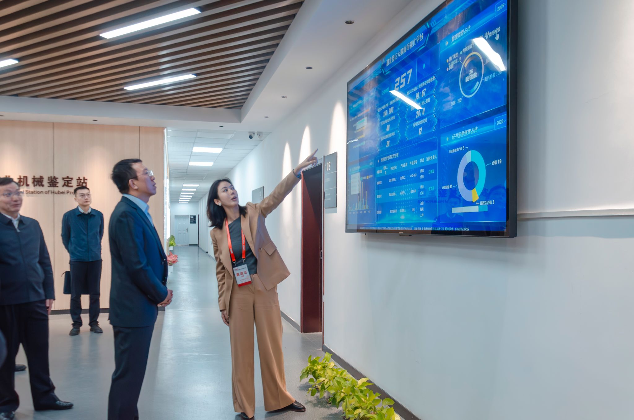 调研组一行深入北斗智能农机检测实验室、电气综合性能检测实验室等实验室,实地考察湖北站在智能农机装备检验检测领域的创新实践。王松细致询问了北斗定位系统在农机作业中的精度验证流程,并对科研人员的晚间坚守表示赞许。随后,在听取湖北站关于“鉴定大数据可视化平台”以及“检验检测推动创新农机产品研发熟化应用”模式的汇报演示时,王松仔细观看了平台各项功能的实时运行,并就数据应用的深度与广度提出了指导性意见。他对湖北站积极发挥“技术孵化器”作用的探索表示认可,并鼓励其继续为智能农机鉴定检测和鉴定检测的智能化发展贡献力量。
