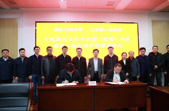 在红安县人民政府会议室,学校与红安县举行百校联百县兴千村暨“双百”科技赋能工程行动合作签约仪式。签约会上,红安县委副书记、代县长钟林对宋小春一行的来访表达了欢迎,对学校一直以来的帮扶表示了感谢。他期待湖北工业大学一如既往地加强对红安县的支持,在产业发展、人才支持、教育文化等方面,校地双方进一步创新与深化合作机制,取得更多的校地合作佳绩。