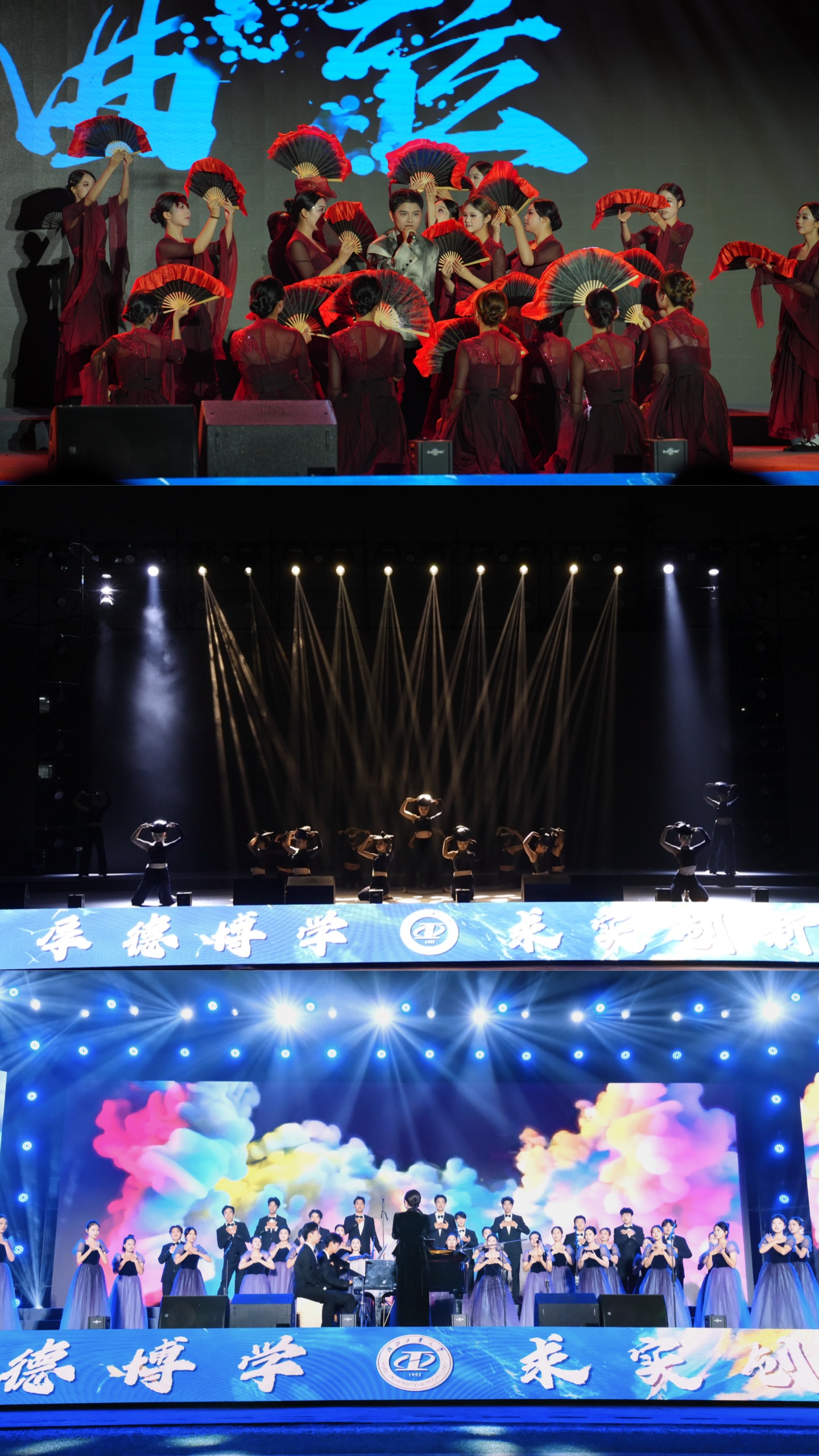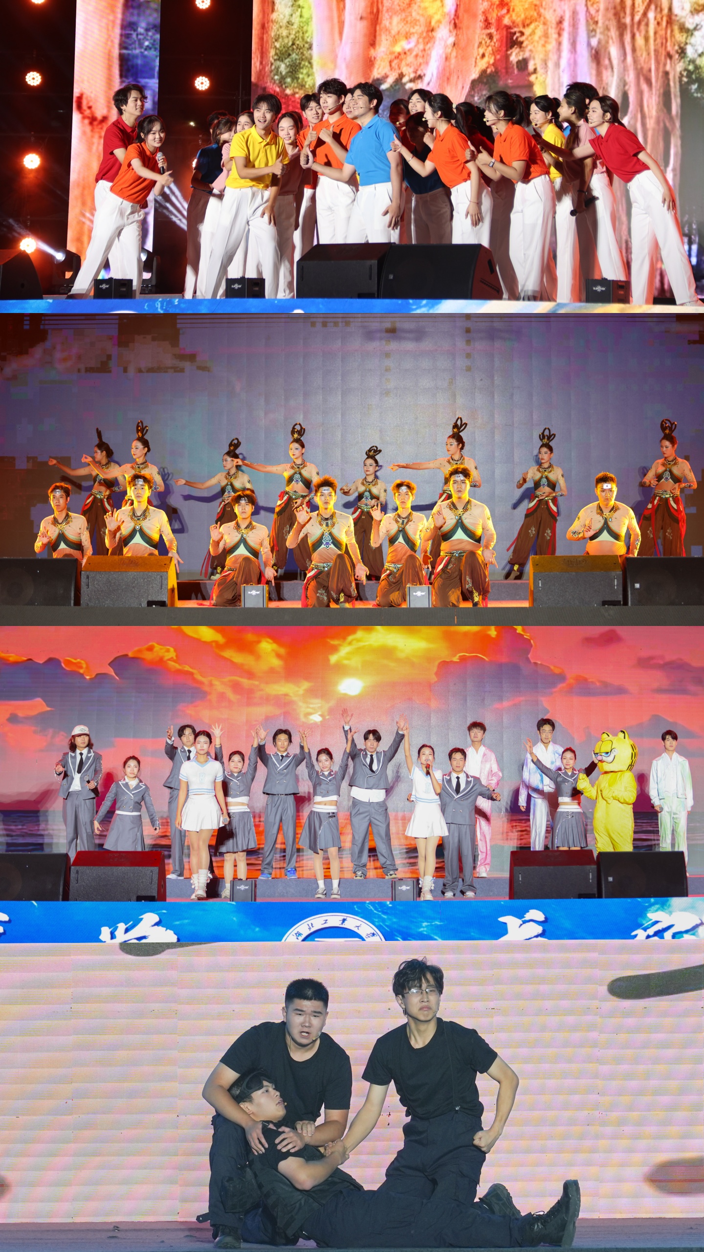 戏曲表演《爱国志士·京韵风华》结合刀马旦的飒爽、老生的豪迈和青衣的温婉,诠释了古今仁人志士矢志爱国报国的坚定信念;学校音韵国乐社的同学们用民乐与现代电声交融的形式演奏了民乐《国韵新声》,用音乐架起连接现代和传统的桥梁;舞蹈串烧《舞力全开》用动感青春的表演点燃现场氛围,焕发出青年学子向上生长的蓬勃朝气;情景表演《薪火暖书山》生动再现了学校爱心助学社20余年坚守支教初心,潜心志愿服务,让青春之花绽放在基层一线的感人瞬间。