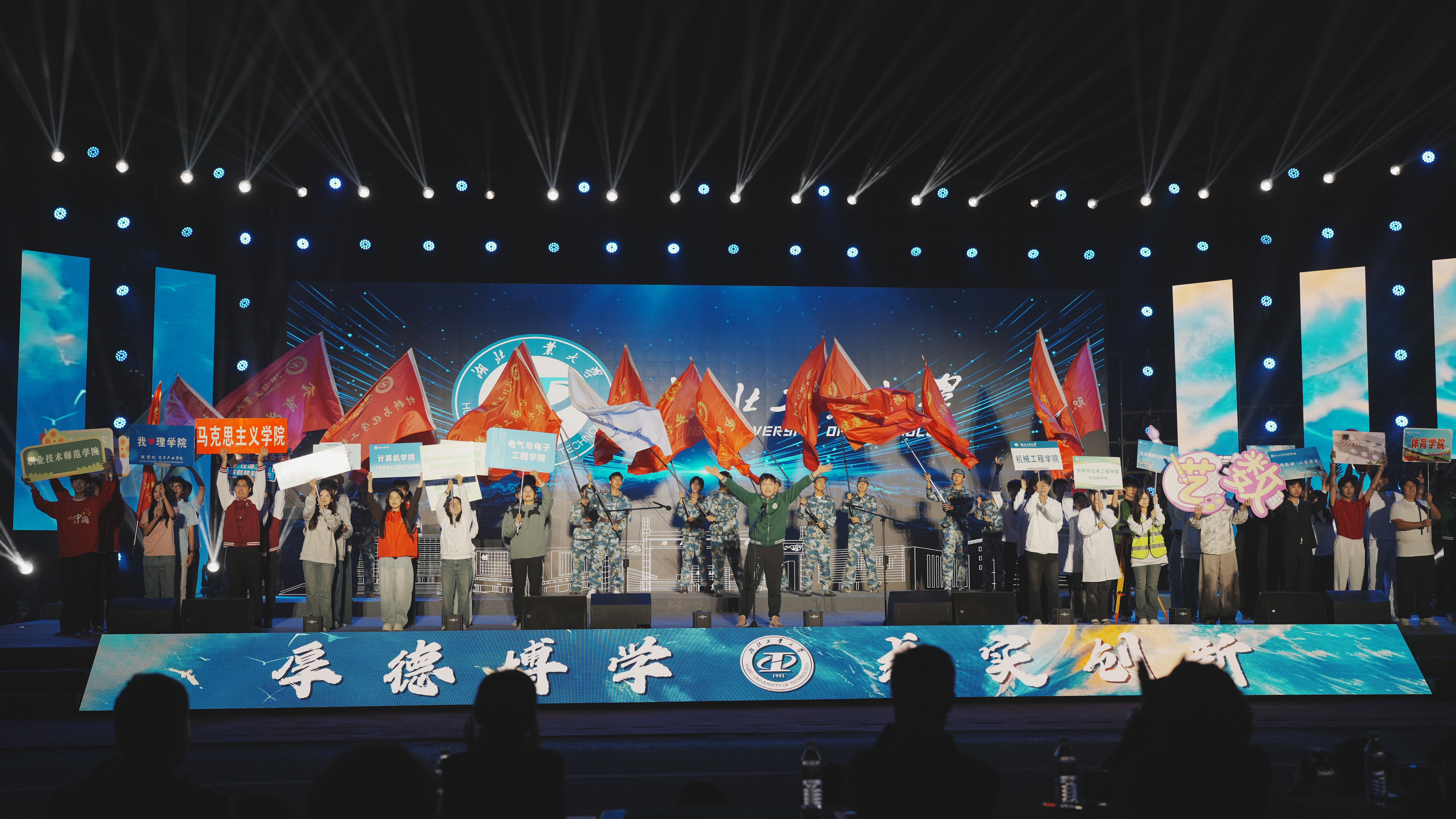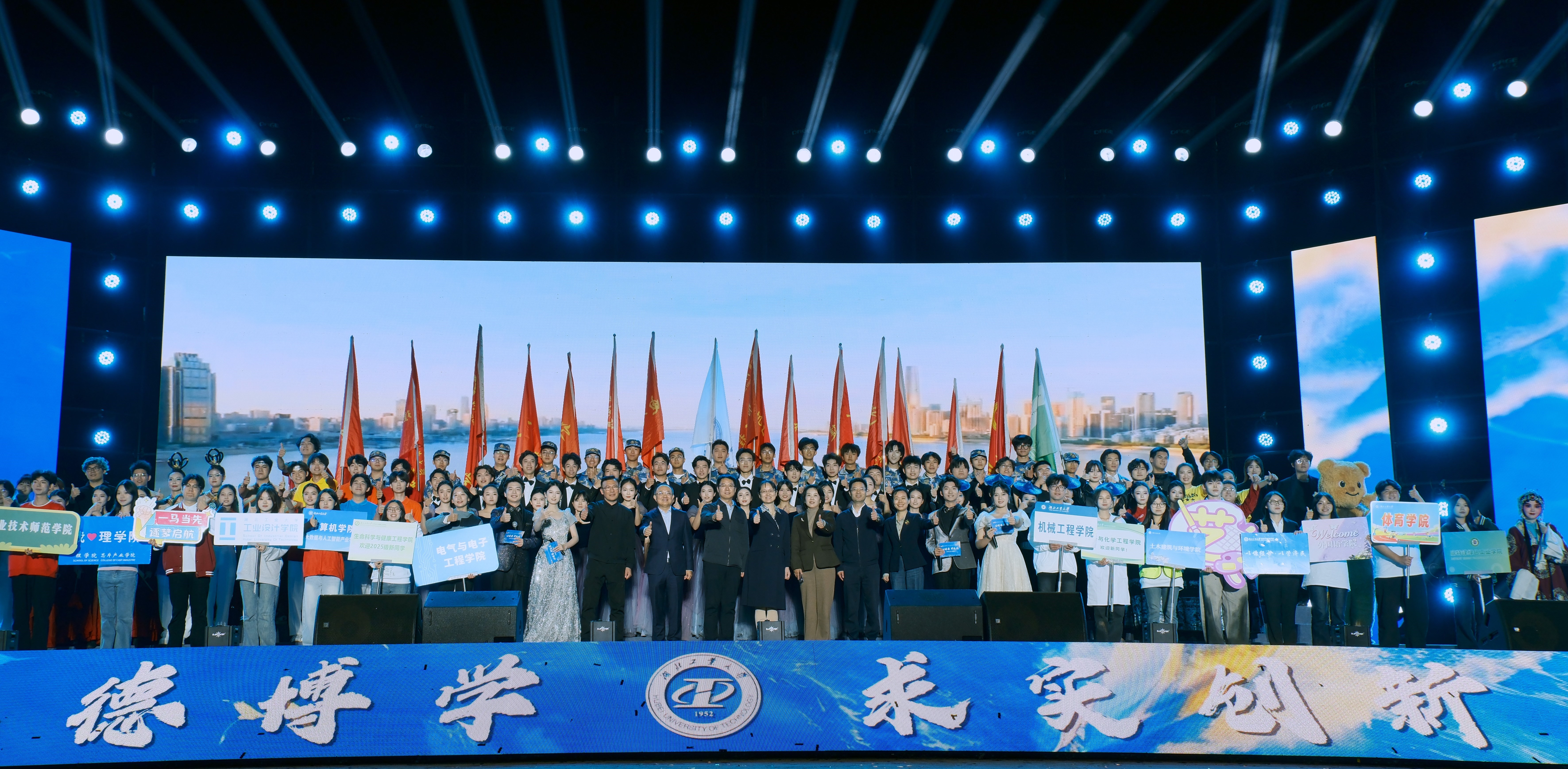 “南湖水,长江波,日夜流淌我心中的歌···”,晚会最后,全体在场师生饱含赤诚与眷恋齐唱校歌,共同祝愿母校在工业强国的征程上绽放华光。