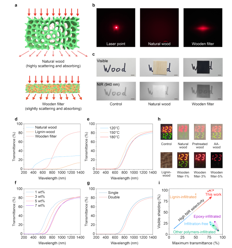 鉴于wooden filters独特的光学性能,作者深入探讨了其背后潜藏的光学机制和调控原理。研究表明,wooden filters的高近红外选择透过性得益于其致密的内部结构、平整的表面以及木质素赋予的紫外–可见光吸收特性。在结构与组成的协同作用下,wooden filters能够完全屏蔽600 nm以下的光,同时在1400 nm处的近红外透过率超过80%。这种独特的近红外选择性是以往木基光学材料(如树脂复合透明木材、木基透明薄膜、木质素复合木基光学材料)所无法实现的(图2)。
