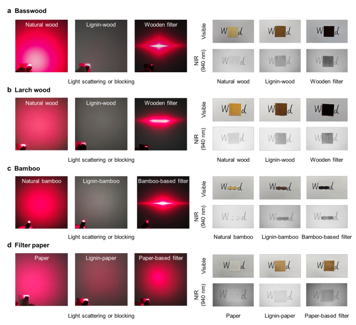 在实现独特光学性能的基础上,作者进一步展示了所提出的木质素富集策略的优异普适性。通过该策略,作者成功地将椴木、松木、竹子和滤纸加工成近红外透明材料(图3)。这些具有不同结构、组成和密度的原料均可用于制备近红外透明材料,充分展示了木质素富集策略的潜力。所制得的可持续生物基滤光片在太阳能近红外资源利用、隐私保护、加密等领域展现了良好的应用前景。