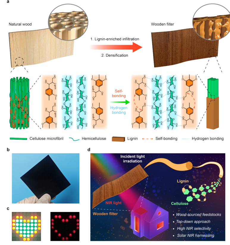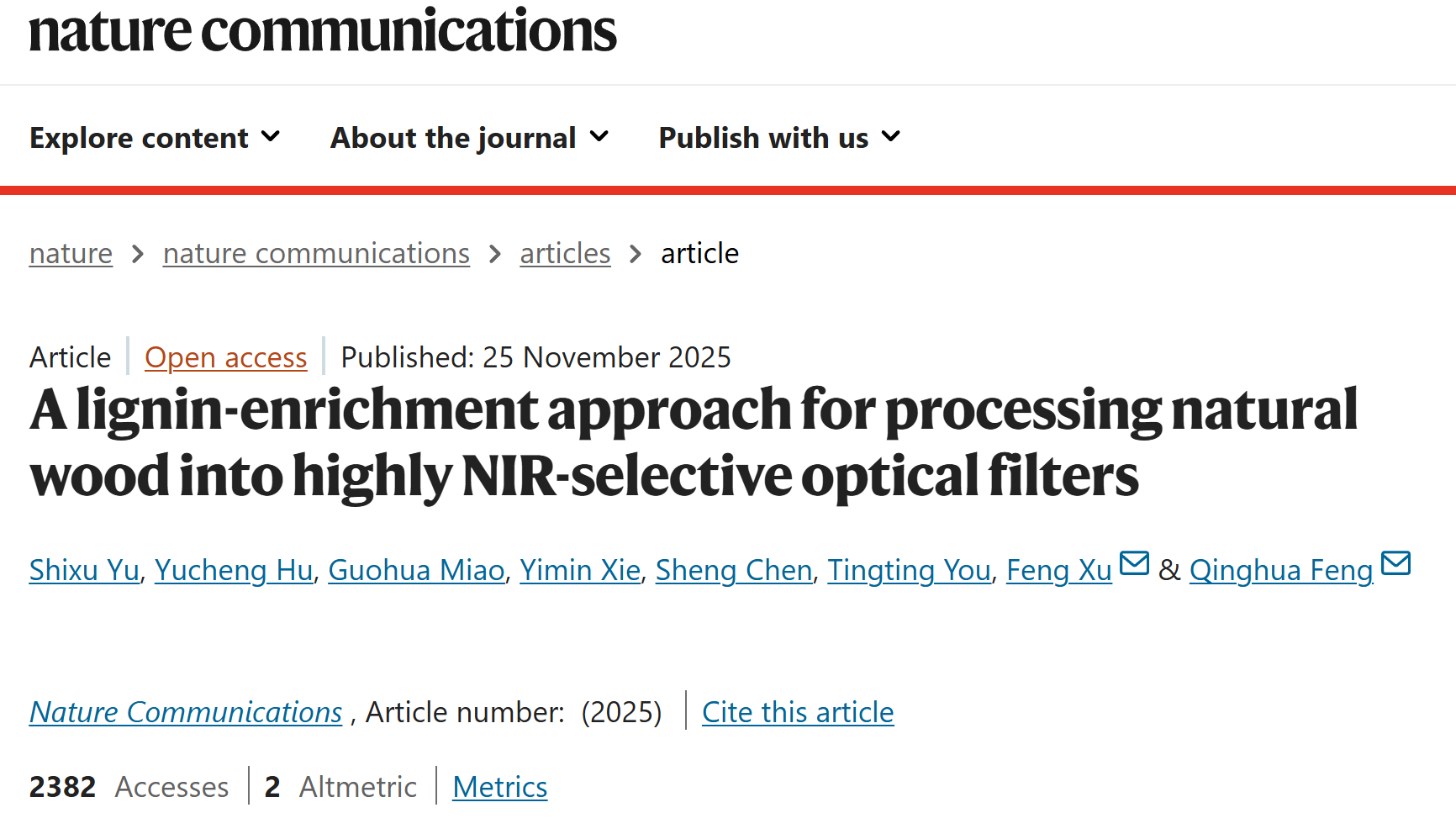 2025年11月25日,我校材料与化学工程学院、绿色轻工材料湖北省重点实验室、制浆造纸研究院在国际顶级学术期刊《Nature Communications》上发表了题为《A lignin-enrichment approach for processing natural wood into highly NIR-selective optical filters》的科研成果。我校为论文第一署名单位, 2024届硕士毕业生余诗旭和2022届硕士毕业生胡愈诚为共同第一作者,冯清华副教授为通讯作者,研究团队还包括谢益民教授。