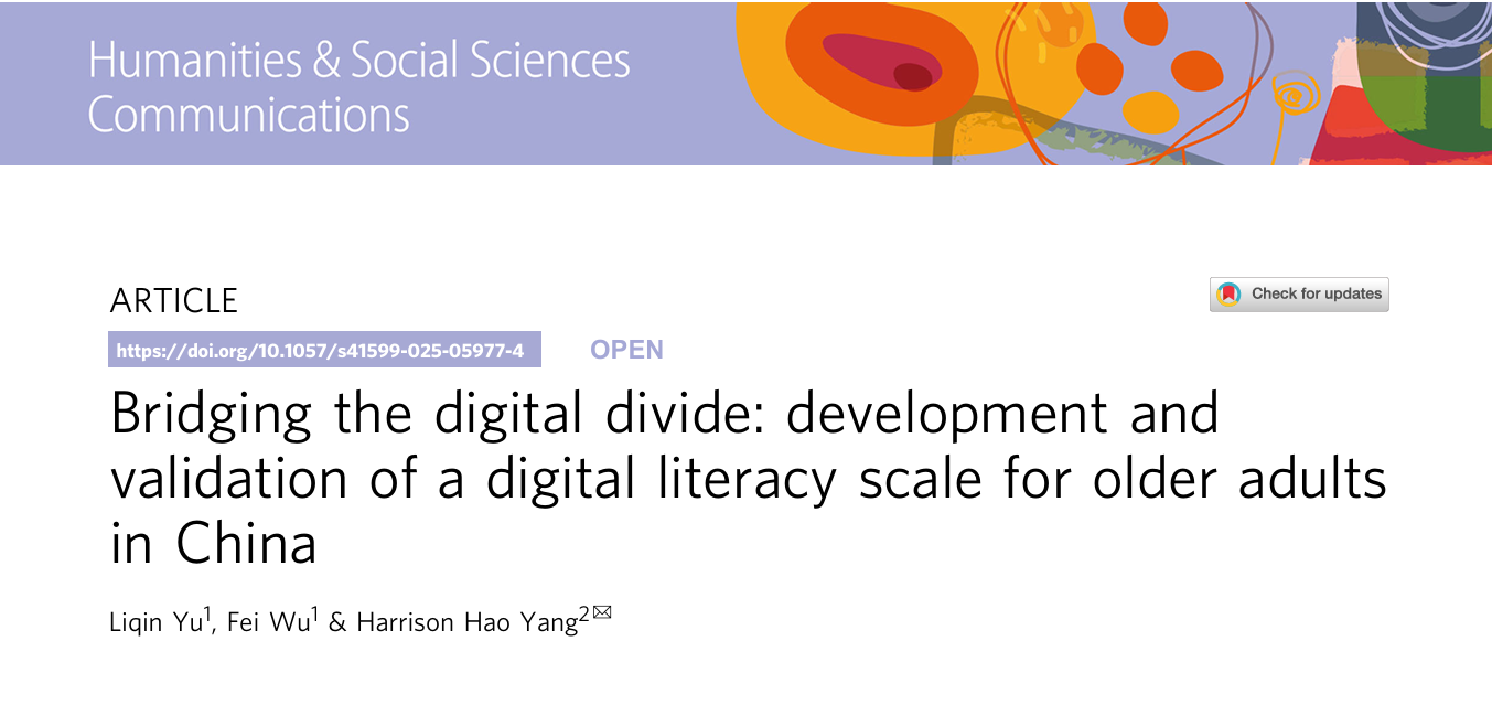 近日,我校职业技术师范学院青年教师余丽芹在Nature子刊《Humanities & Social Sciences Communications》 (《人文与社会科学通讯》)发表题为“Bridging the digital divide: development and validation of a digital literacy scale for older adults in China”的研究论文,余丽芹老师为论文第一作者,其指导的硕士研究生吴飞作为第二作者,美国纽约州立大学奥斯威戈分校杨浩教授作为通讯作者,湖北工业大学为第一完成单位。