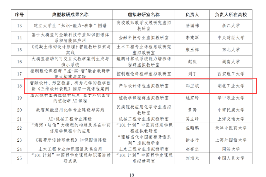 该虚拟教研室骨干成员邓昭教授主持的《三维设计表现》课程,凭借其创新的线上线下混合式教学模式与扎实的应用成效,成功入选“全国50项典型教研成果”;其教研论文《德智共融、交叉融合设计学四型人才培养模式改革与实践》在教育部虚拟教研室内刊《高校智慧教研》上发表。湖工大虚拟教研室取得这些重要成果,标志着我校在教育教学数字化融合创新方面已走在全国前列。