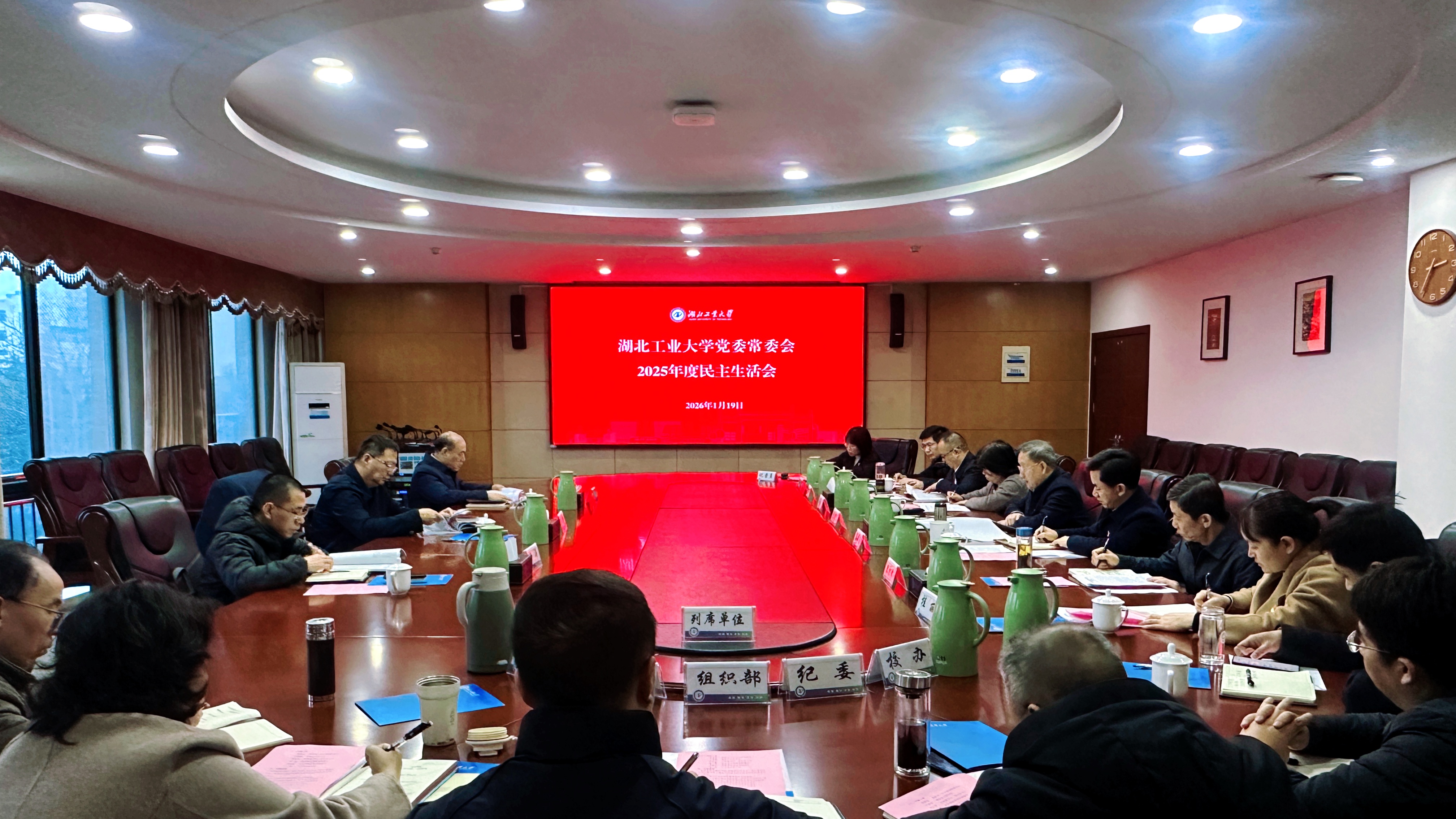 根据中央部署和省委要求,1月19日下午,学校党委常委会召开2025年度民主生活会,深入学习贯彻习近平新时代中国特色社会主义思想,全面贯彻落实党的二十届四中全会精神和习近平总书记考察湖北重要讲话精神,以打攻坚战、持久战的决心和恒心,锲而不舍落实中央八项规定精神,推进作风建设常态化长效化。省委第十六督导组组长张晋带队到会指导。校党委书记彭育园主持会议并讲话。
