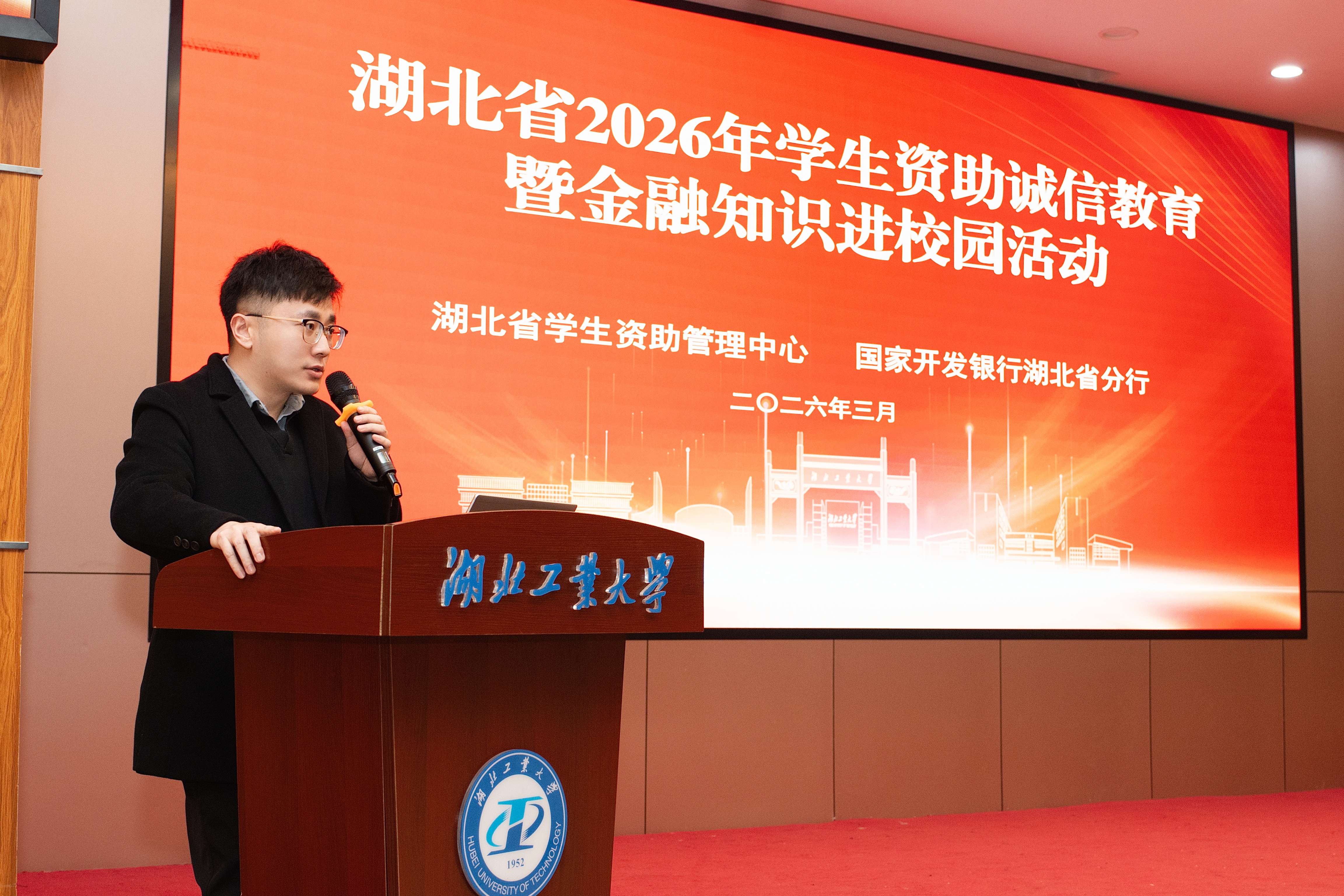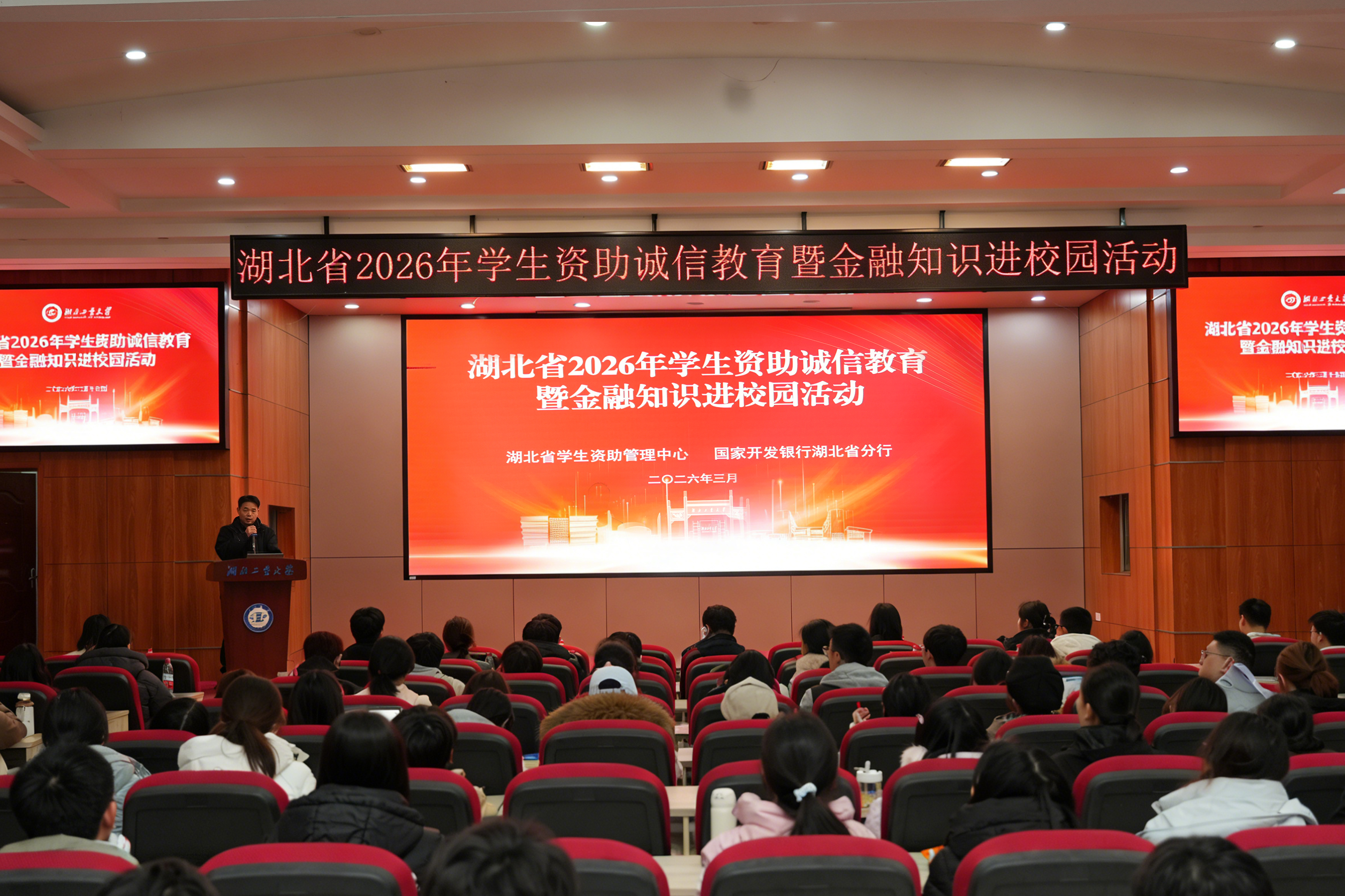 3月17日下午,湖北省2026年学生资助诚信教育暨金融知识进校园活动在我校博学堂举行。湖北省学生资助管理中心邓泽涵,国家开发银行湖北省分行副处长武昭明、团委书记沈珊珊,中国人民银行湖北省分行熊晓红、交通银行武汉分行施扬翼等领导嘉宾出席活动。会议由学校学生工作部副部长张承涛主持。