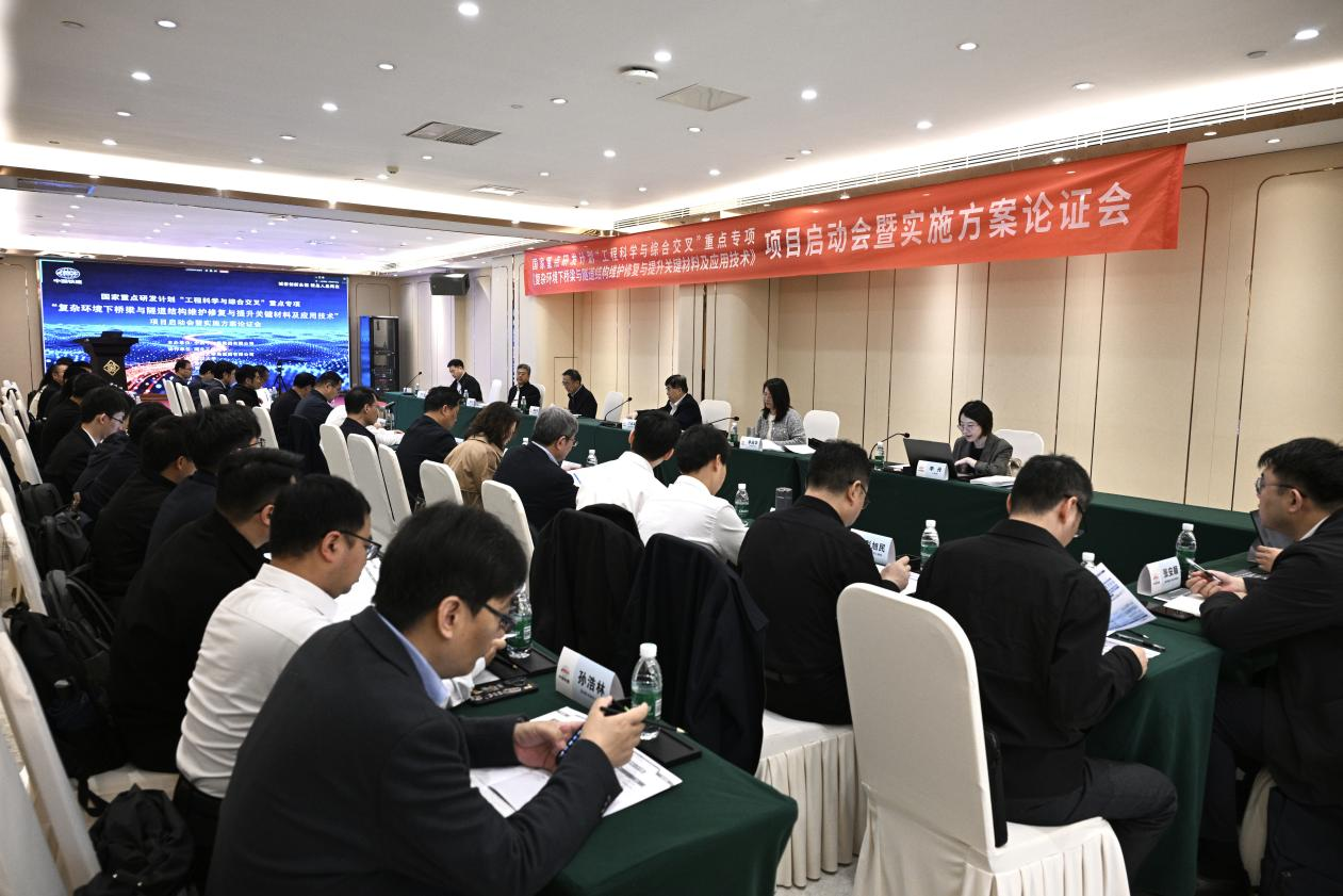 国家重点研发计划“工程科学与综合交叉”重点专项—“复杂环境下桥梁与隧道结构维护修复与提升关键材料及应用技术”项目由我校贺行洋教授主持,项目由中铁十一局集团有限公司牵头,联合湖北工业大学、中铁大桥局、武汉大学、郑州大学、安徽建筑大学等6家单位共同承担。中国工程院院士高宗余、中铁十一局集团有限公司总经理周晗等70余名专家学者出席了项目启动会暨实施方案论证会,高宗余担任实施方案论证会专家组组长。王从严代表学校向出席论证会的专家学者、合作单位表示热烈欢迎,向一直以来关心支持我校科研工作的合作单位、各位同仁致以诚挚的感谢。