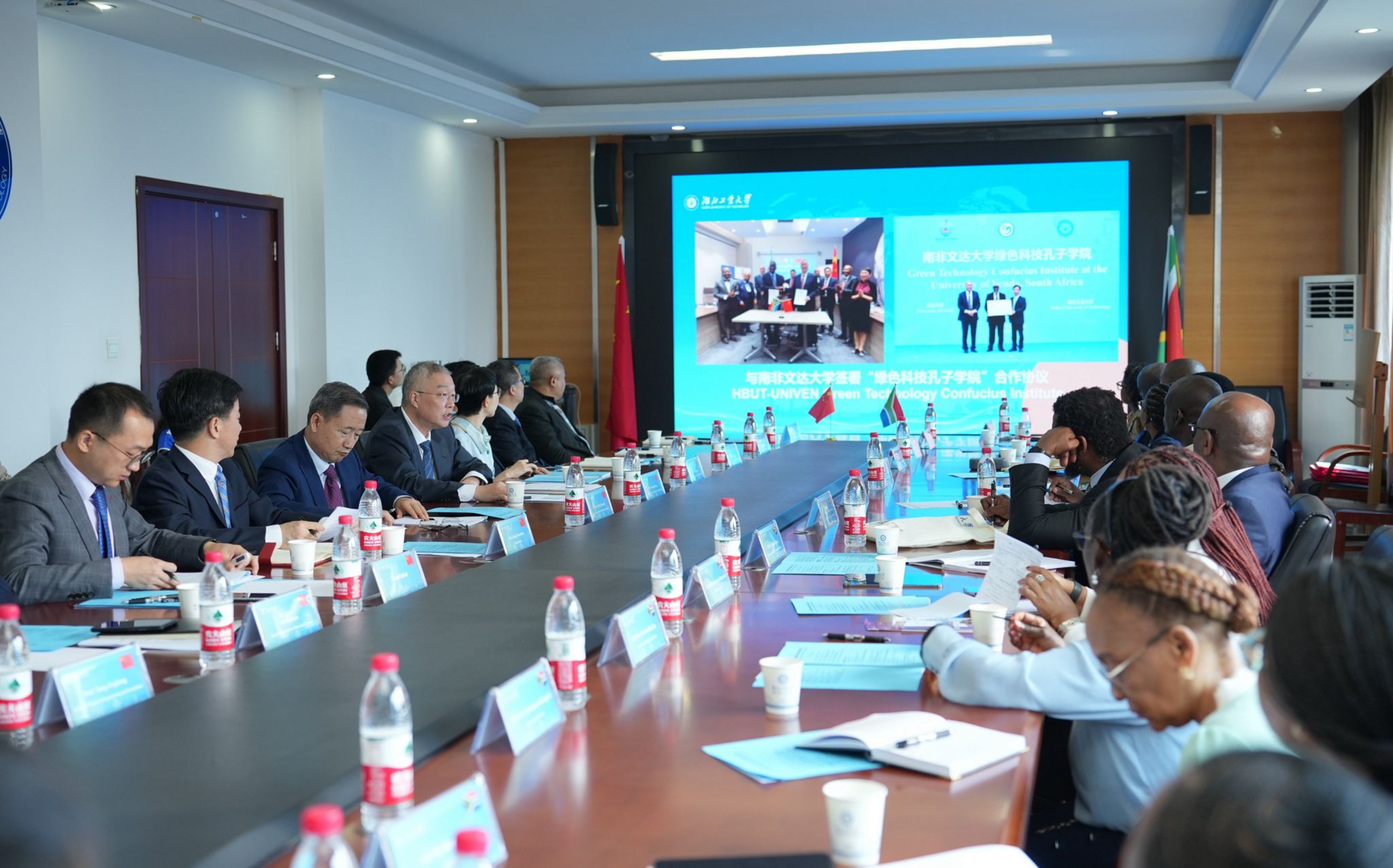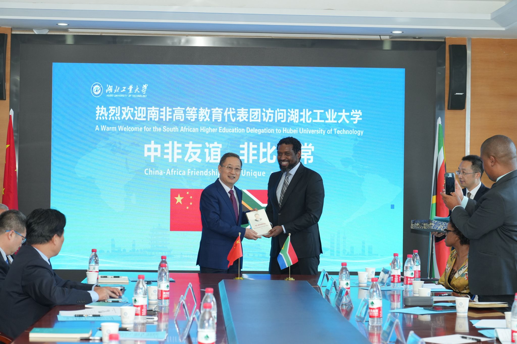 马纳梅拉对我校的热情接待表示衷心感谢。他指出,湖北工业大学对非合作的显著成效令代表团成员印象深刻,他非常欣慰地看到学校与南非多所高校及相关政府部门及企业已经有了深入务实的合作,尤其是与南非文达大学共建的绿色科技孔子学院,除了开展语言教学之外,还在开展光伏氢能等方面的科研合作。他欢迎湖北工业大学和南非更多高校及科研机构建立战略伙伴关系,在学术交流、人才培养、联合科研、技术创新等方面开展务实合作。他表示,南非高教科创部作为推进高教及科学创新领域国际合作的主要政府部门,将不遗余力地支持以湖北工业大学为代表的中国高校与南非高校及企业的交流合作。