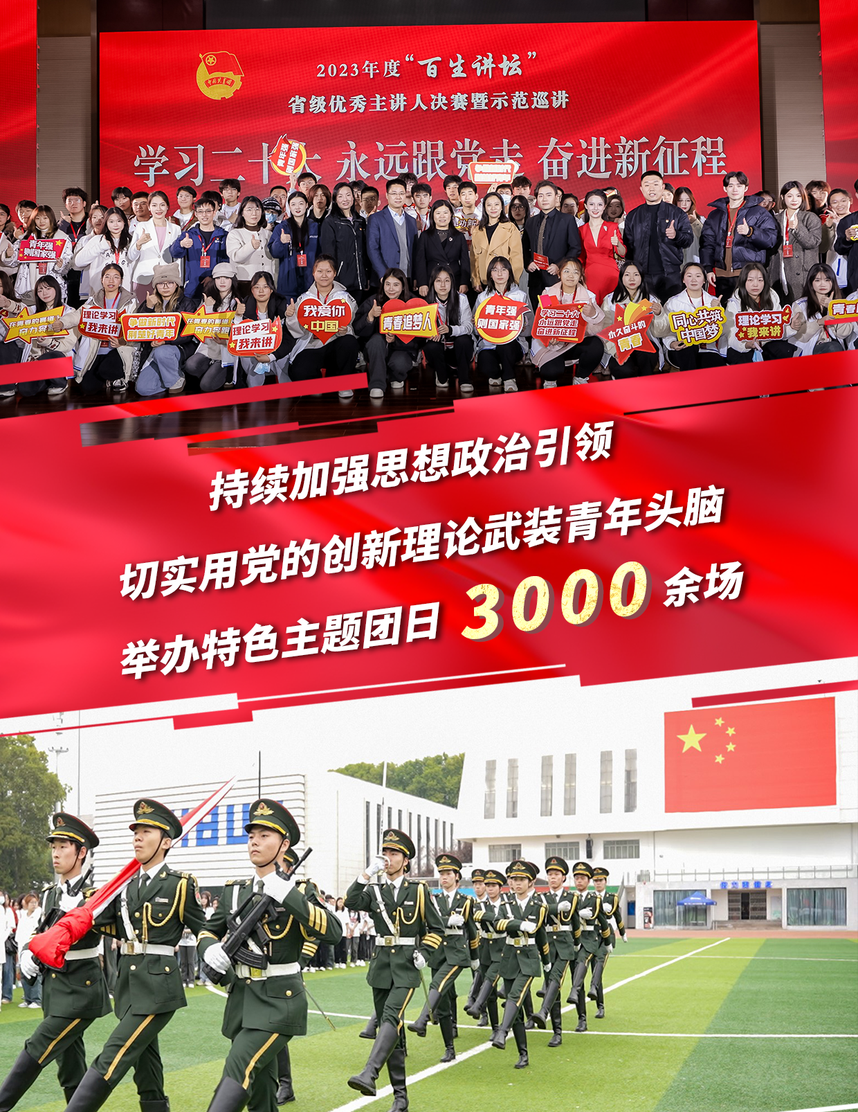 扎实开展团员和青年主题教育,举办特色主题团日3000余场,组建理论“青骑兵”宣讲团,用“生动故事+深刻理论”的方式开展宣讲244场,实现了对全校团员青年参与全覆盖,受到时任团省委书记周森锋的充分肯定。隆重举办“五四”表彰大会,承办“百生讲坛”省级优秀主讲人复赛和决赛,进一步激发湖工大学子青春向党、矢志奋斗的内生动力。