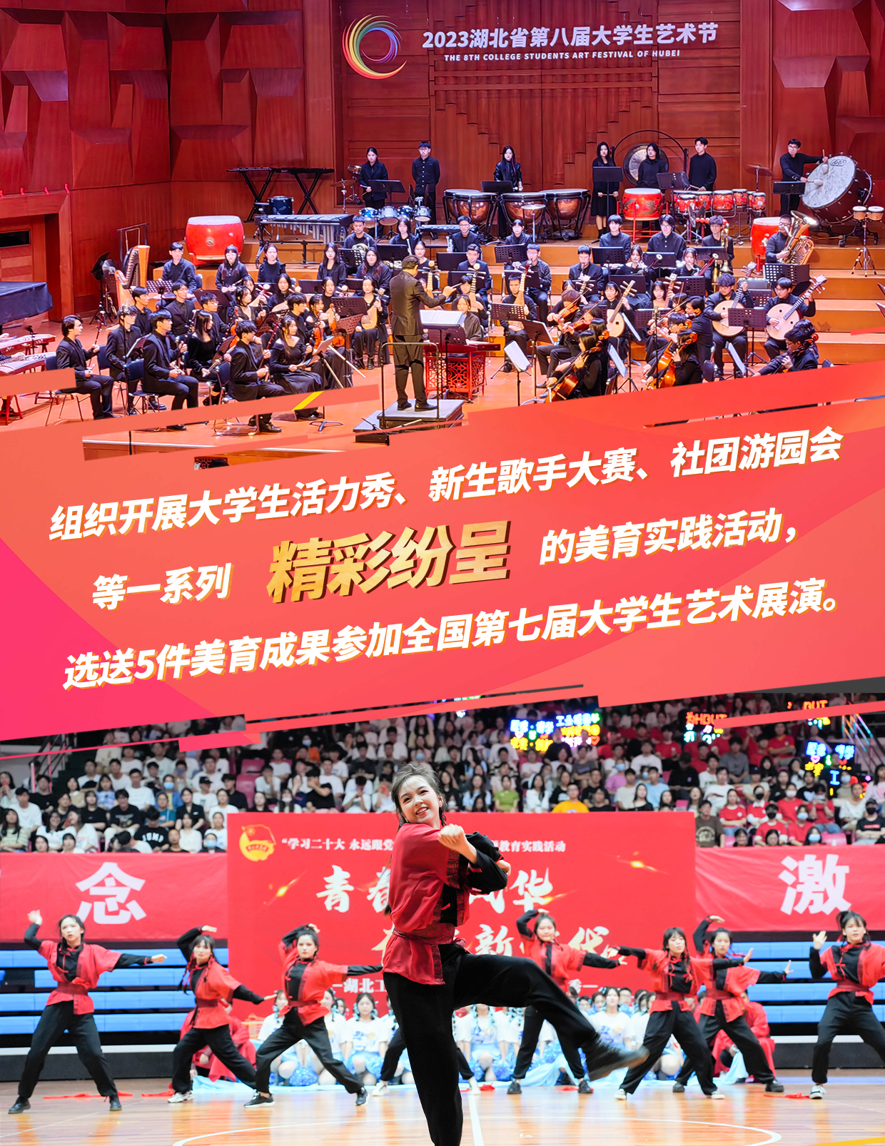 进一步完善“四维联动、四位一体”美育工作新格局,打造“学校公共美育+学院专业美育”的美育课程体系,实现校院美育课程和学分的全覆盖。组织开展大学生活力秀、管弦乐音乐会、新歌赛、社团游园会等精彩纷呈的美育实践活动,学校5项美育成果入选全国大学生艺术展演,引导青年学生在美育实践中表现美、创造美、传播美。