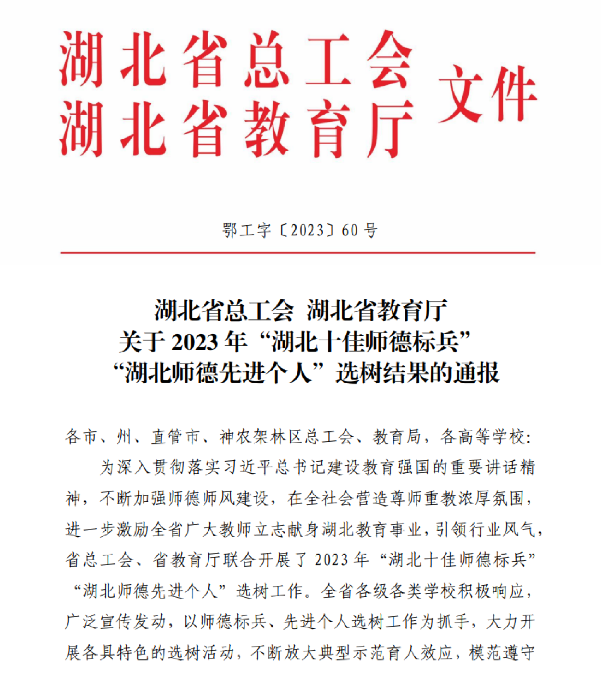 “湖北十佳师德标兵”“湖北师德先进个人”选树活动自2023年10月启动,经过全省各级各类学校广泛宣传发动、组织申报、民主评议、遴选推荐,上级工会审核初评、组织专家评审、媒体公示等程序,省总工会、省教育厅决定命名“湖北十佳师德标兵”10名,“湖北师德先进个人”30名。
