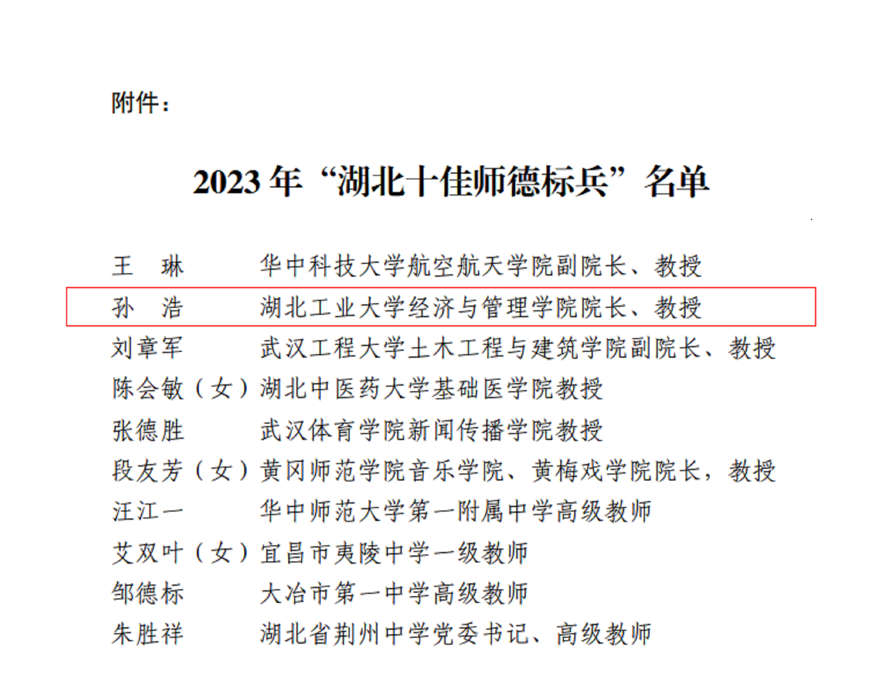 日前,湖北省总工会 湖北省教育厅联合印发《关于2023年“湖北十佳师德标兵”“湖北师德先进个人”选树结果的通报》(以下简称《通报》),我校经济与管理学院院长孙浩教授获评“湖北十佳师德标兵”。
