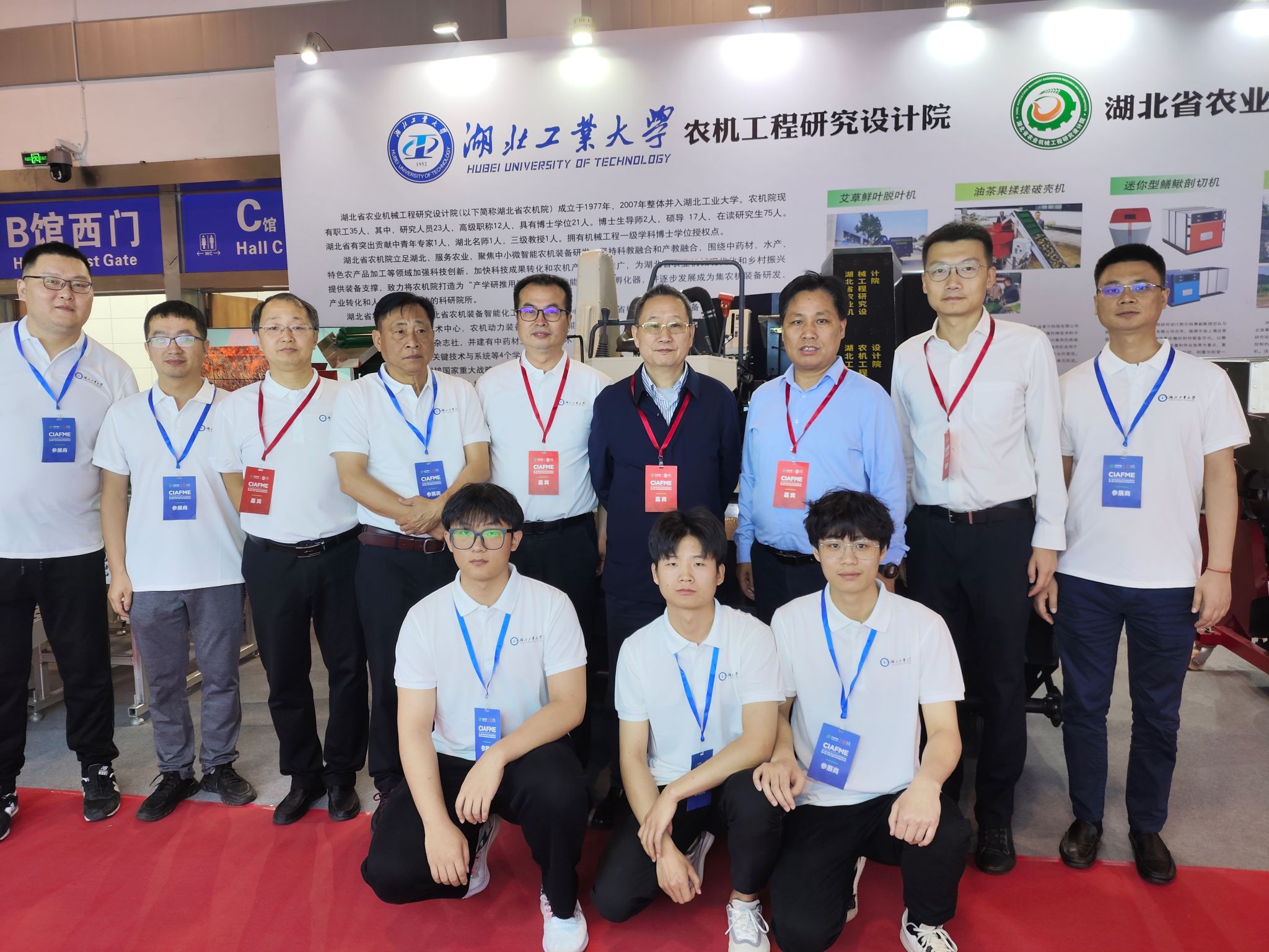 在开幕式之前,彭育园来到农机院展台,关心慰问参展师生,并对他们表示诚挚的祝贺。他充分肯定了农机院近年科研工作取得的快速发展,认为农机院农机装备此次参展,迈出了我校农机走出湖北、走向全国、走向市场的关键一步。他详细询问了解参展产品的性能特点,与研究生们亲切交谈,语重心长地勉励他们勤奋钻研、打牢基础、学好本领,在积极参与科研项目的过程中磨砺成长,提高专业技能和素养,早日成为农机行业的接班人和主力军。他希望农机院以参加此次全国性大型展会为契机,学习业界先进同行的经验做法,进一步加强农机科技创新,推出更多更好的智能农机装备,切实提高湖北省农机院的行业知名度和全国影响力,擦亮湖北工业大学的农机底色,为湖北农业高质量发展贡献力量。
