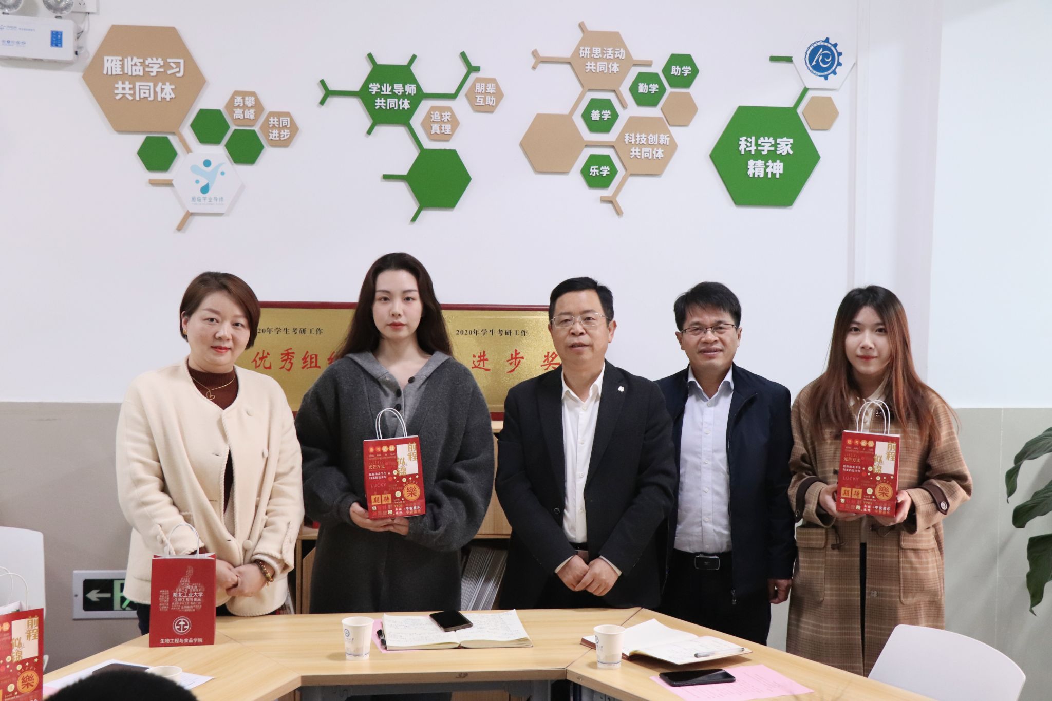 活动最后,校院领导老师们一起为考研学生送上好运福袋。本次活动特别设计了多个版本的好运福袋,覆盖考研、就业、考公、出国等不同规划的学生,福袋里内容丰富,既有“一生一食”定制版旺仔牛奶、学弟学妹手写祝福的刮刮乐明信片,又包含富有学院特色的科学家徽章和“小糯米”加油贴纸。收到祝福满满的特色福袋,20食品3班的杨嘉和激动地表示:“学院的鼓励是我备考过程中最好的礼物,我一定会加倍努力,不辜负老师们的祝福和期望。”