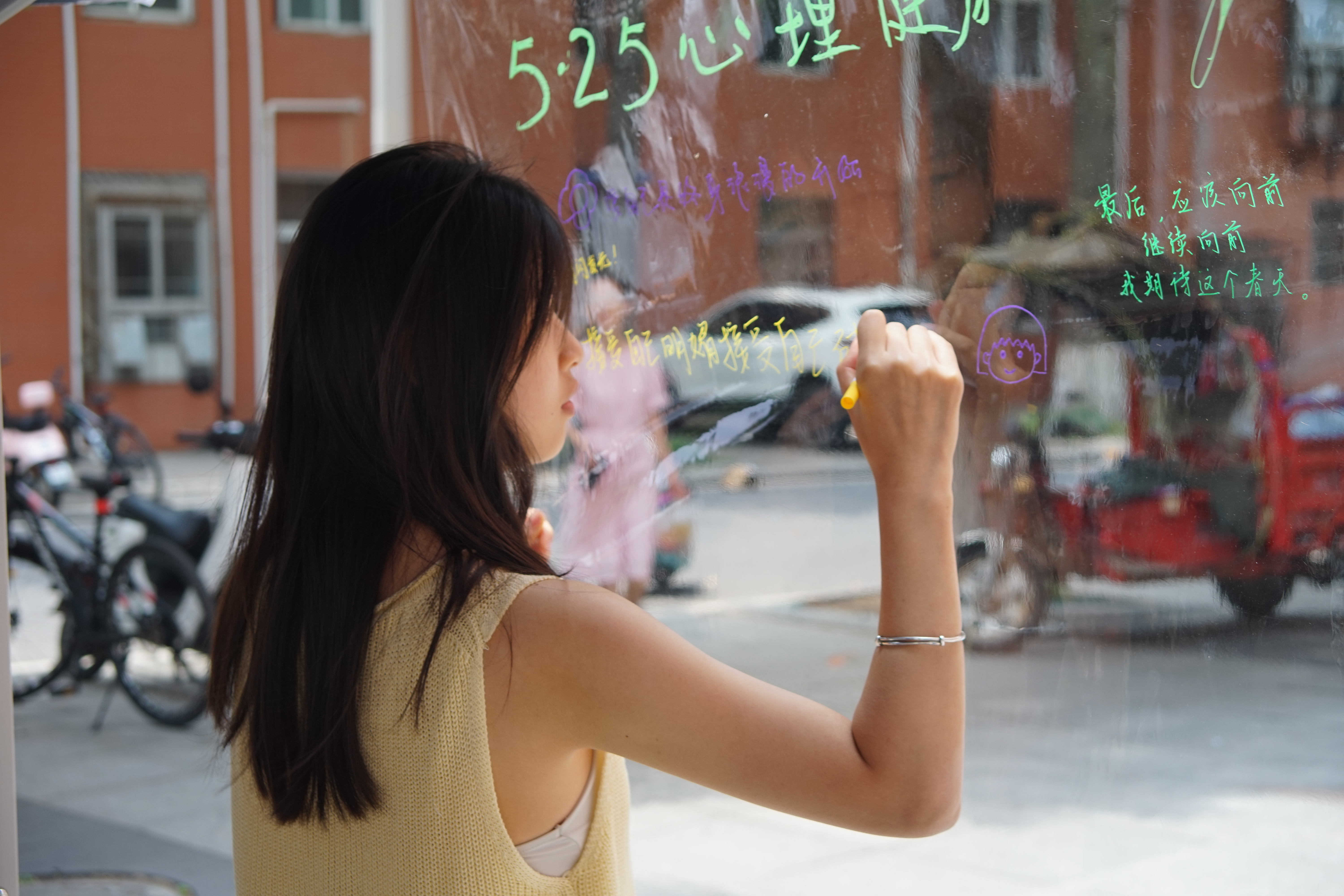 “情绪复刻馆”内,一面布满照片的打卡墙成为全场焦点。同学们通过模仿不同情绪对应的表情与动作,将生活中的喜怒哀乐具像化地呈现在镜头前。工作人员现场打印照片并拼接成动态情绪墙,既展现了青春洋溢的多元面貌,也引导参与者以客观视角观察自我情绪。透明薄膜涂鸦区则成为个性表达的自由场域,一句句即兴书写的内心感悟,在光影流转中构筑起心灵对话的桥梁。