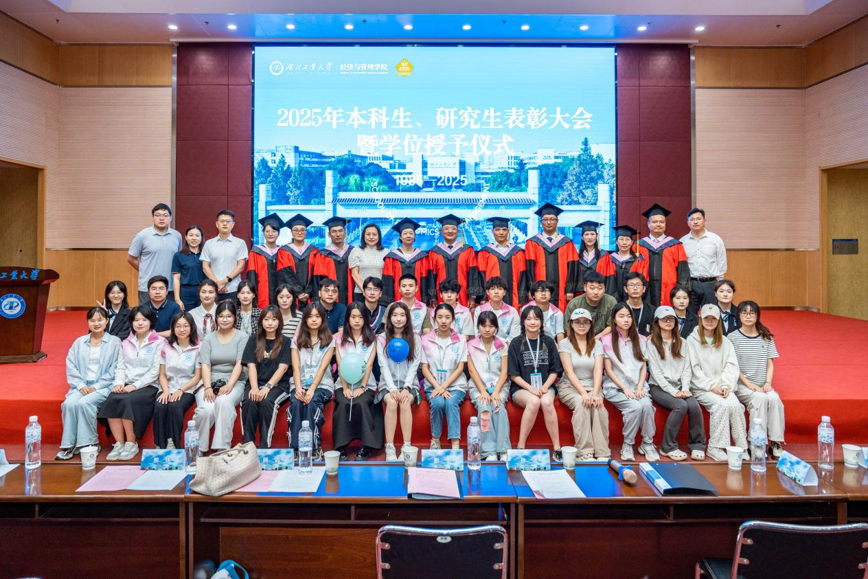 6月10日上午,经济与管理学院在图书馆报告厅举行2025年本科生、研究生表彰大会暨学位授予仪式。教务处处长孙浩、国际学院院长杨霞、底特律学院副院长熊伟(主持工作)、学院全体领导班子成员、师生代表和毕业生家长代表共300余人出席本次活动,活动由学院党委副书记余贞主持。