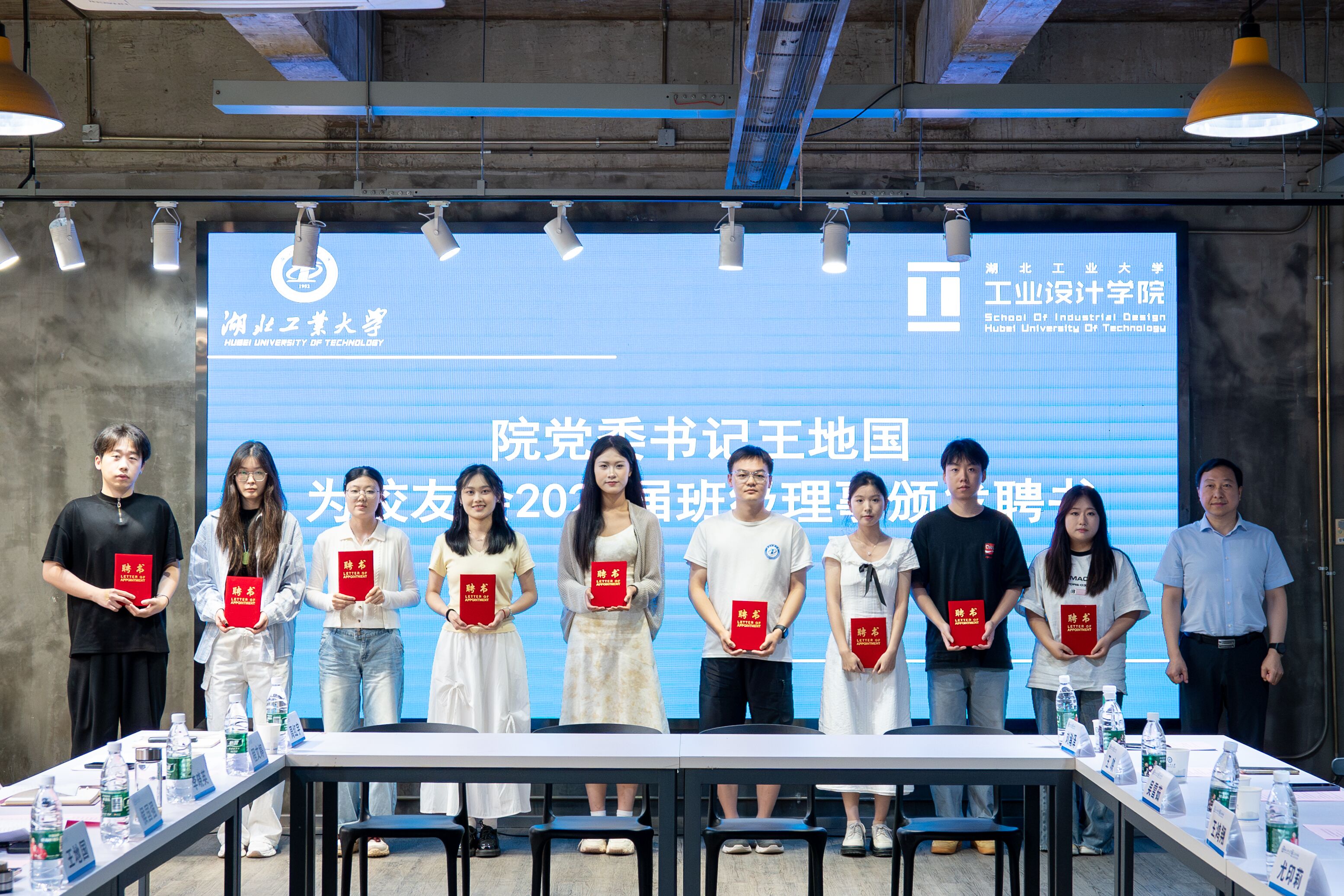 校友理事聘任环节,院长邓卫斌宣读了《关于聘任工业设计学院校友会2025届班级理事的通知》,院党委书记王地国各位班级理事颁发了聘书。