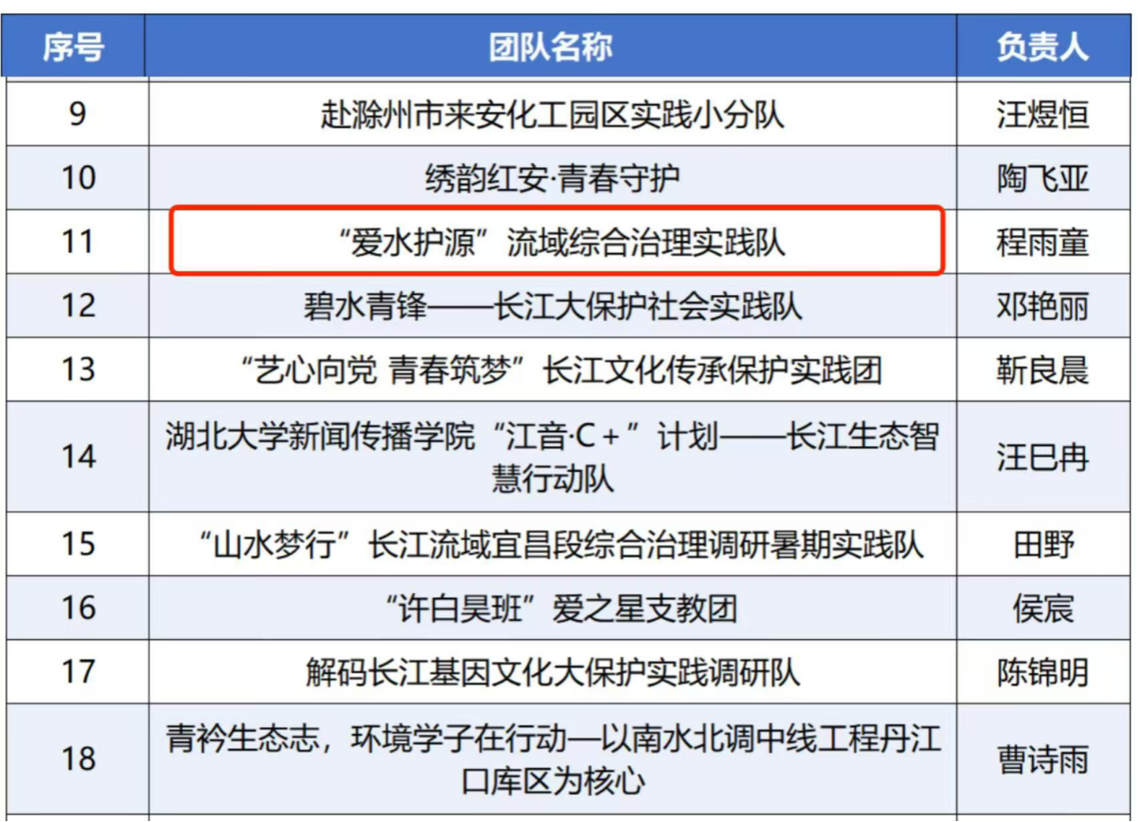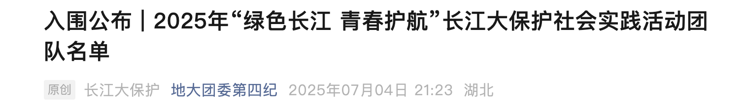 近日,经共青团中央青年发展部、共青团湖北省委的工作指导,共青团中国地质大学(武汉)委员会在公布了全国入选2025年“绿色长江 青春护航”长江大保护社会实践活动的125支团队名单,我校土木建筑与环境学院“爱水护源”流域综合治理实践队成功入选。
