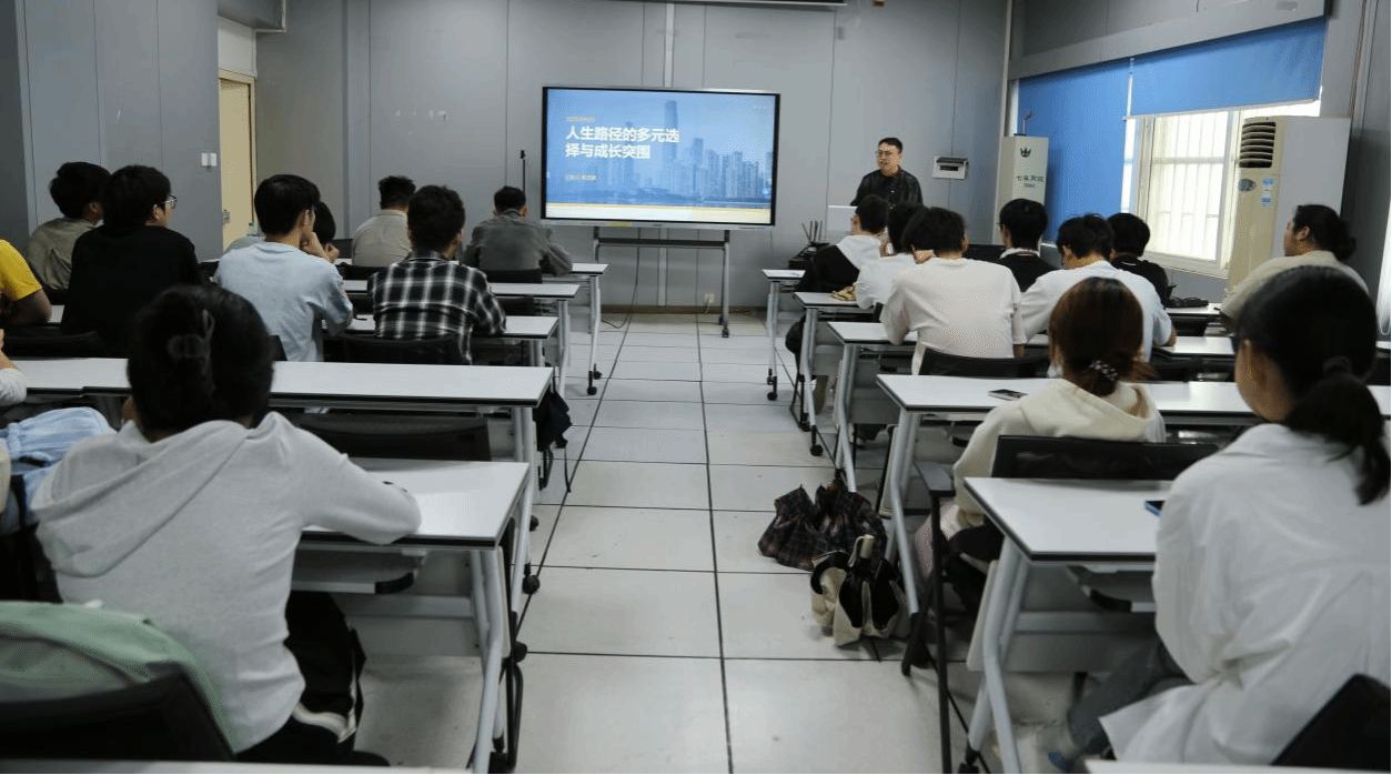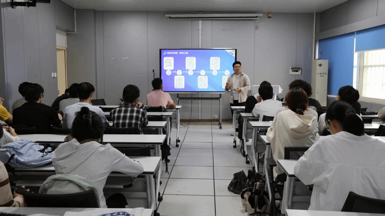 王强首先讲述了自己从贵州山区学子到科技企业创始人的奋斗历程,坦言创业之路时刻面临挑战,而“接受风险、持续选择”才是破局的关键。他分享自己所主导的“清菌厕”智能环保项目,让同学们切实感受创新创业从市场调研、技术攻坚到落地推广的实践环节。