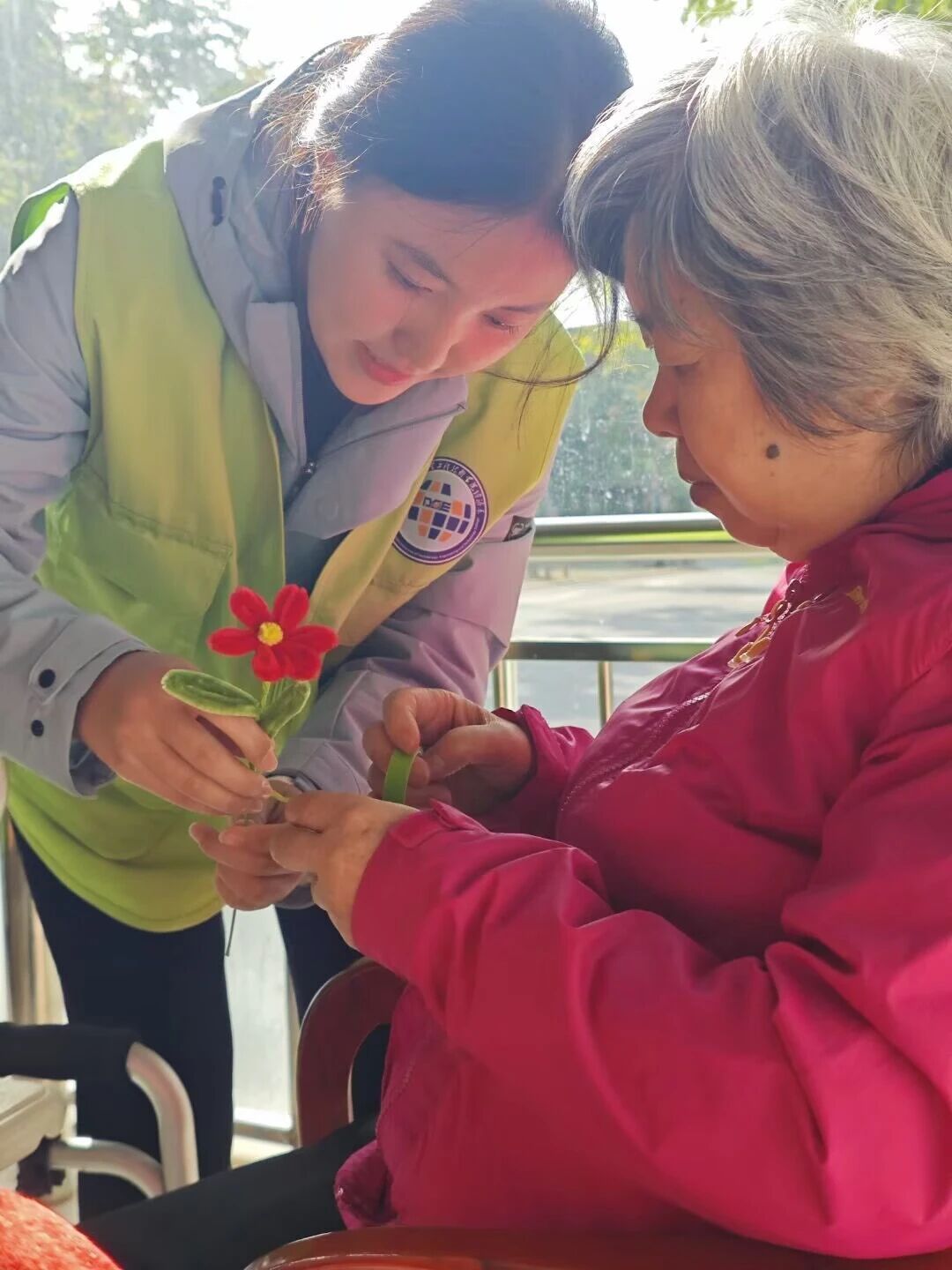 随后,《送你一朵小红花》的旋律如暖阳般洒满整个院落。在轻松愉悦的气氛中,志愿者们与老人们相伴而坐,一起动手制作扭扭棒手工作品。敬老院的李奶奶开心地展示着自己做的小红花,说道:“这姑娘特别有耐心,一步步教我,还夸我手巧,像她奶奶呢!”志愿者陈杏怡也感慨道:“奶奶一边教我编花瓣,一边哼起黄梅戏。那一份乡音里的温暖与信任,比任何手工作品都更打动人心。”老人们在互动中不仅体验到创造的乐趣,也感受到真诚的陪伴。
