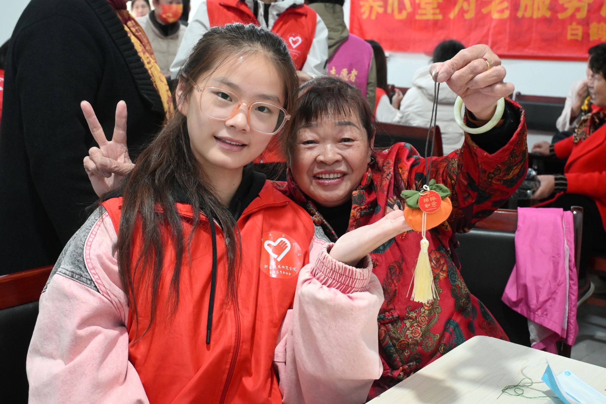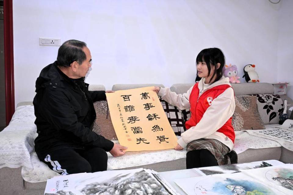 在给老人们传授新技能的同时,志愿者们也成为了传统技艺的聆听者与记录者——书画达人刘老师展卷挥毫,“百善孝为先,万事和为贵”十二字遒劲洒脱,引得同学们赞叹连连;诗词“发烧友”王老师即兴吟诵原创诗篇《看渔门拆迁原址还建并更名“九龙湾”所感》,让大家在平仄韵律中感受到城市的变迁。
