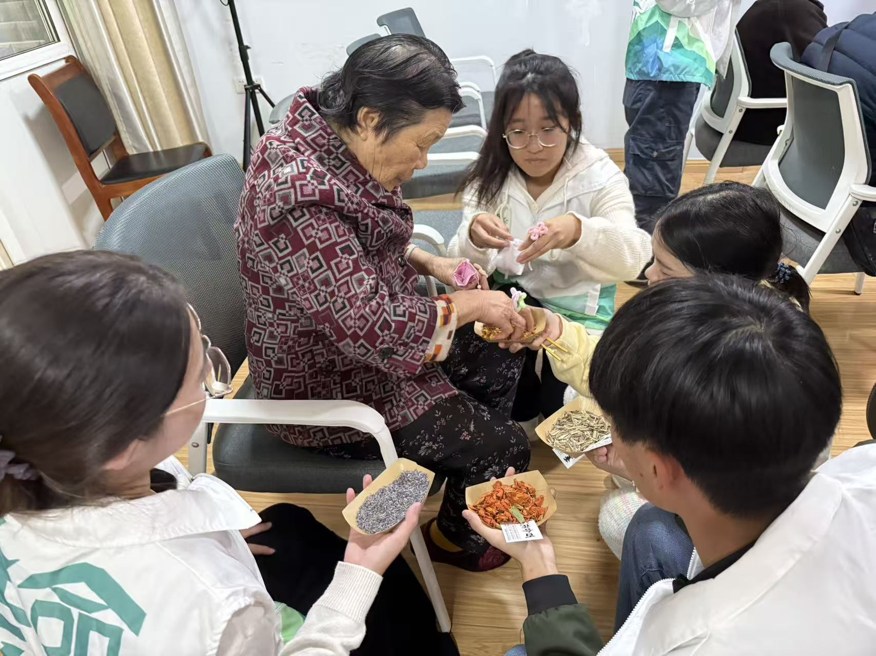 “巧手制香囊” 区域里,晒干的艾草叶片翠绿、丁香颗粒饱满,志愿者已将药材分装成小份。老人们围坐在一起,有的仔细挑选喜欢的香囊布(有绣着“福”字的红布,也有印着菊花的蓝布),有的拿着小勺子往袋里添药材。“多装些艾草,闻着安心,回头给外地的孙辈带一个!”69岁的王奶奶一边添药材,一边教身边的志愿者怎么系彩绳:“绕两圈再打个结,这样药材就不会漏出来啦!”