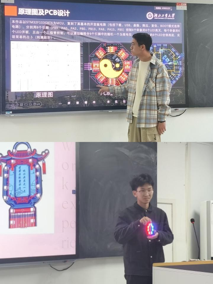 本次大赛吸引了电气、机械、生命、材化等多个学院的学生踊跃参与,参赛作品创意十足、独具匠心。有的作品以母校地图与校训为设计核心,板边辅以流线型铜箔走线,隐喻 “书山有路勤为径” 的学术追求,传递对母校的深厚情感;有的借鉴中国结、宫廷灯笼、道家阴阳鱼等传统元素,部分作品还点缀红色流苏挂饰,兼具装饰与佩戴功能;还有的以凤凰、蝴蝶为灵感,或将电路板设计为小夜灯、校园卡、门禁卡等实用形态,让星罗棋布的电子元件在现代科技算力加持下,成为生活中的装饰佳品与必备好物。参赛学生逐一展示作品,详细阐述文化设计理念、电路原理图、PCB 设计逻辑及程序设计巧思,并进行现场实操演示。评委团围绕科技创新性、文化赓续性、美育表现力等维度展开综合评审,最终确定获奖名单并现场颁奖,氛围热烈融洽。