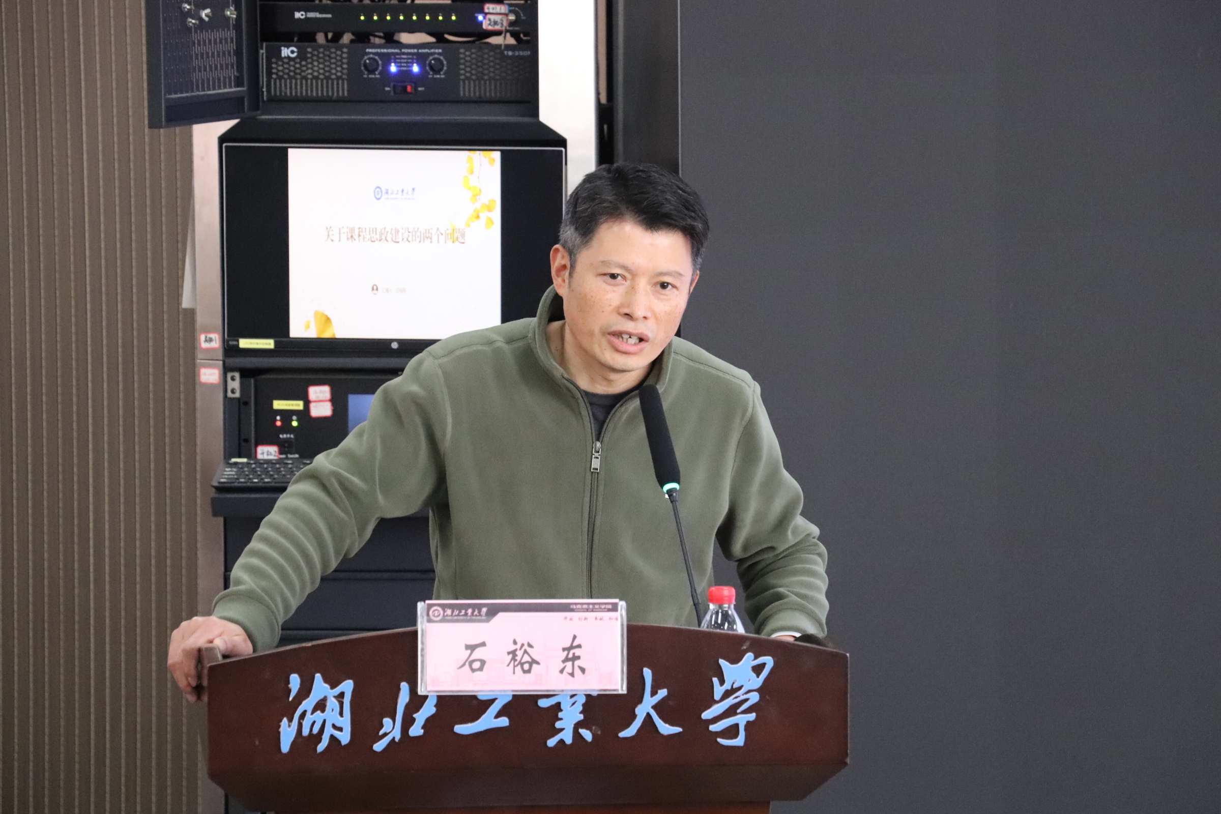 石裕东以“关于课程思政建设的两个问题”为题,结合自身多年思政课教学经验与课程思政研究成果,带来了兼具理论深度与实践温度的专题分享。他从“思政课教师参与课程思政建设的角色定位”和“专业课程思政元素挖掘的核心路径”两方面展开阐述,为在场教师提供了系统的方法论指导。在思政课教师参与层面,他直面当前工作中的痛点问题,深刻剖析了当前存在的思政课教师参与课程思政建设参与面不够宽、参与度不够深、参与积极性不够高等现实困境,明确了相应提升路径;在思政元素挖掘方面,提出从“师、史、是、实、势”五个维度切入,结合不同专业特色分类施策,系统挖掘课程中蕴含的思政资源,推动课程思政建设与专业教学有机融合。